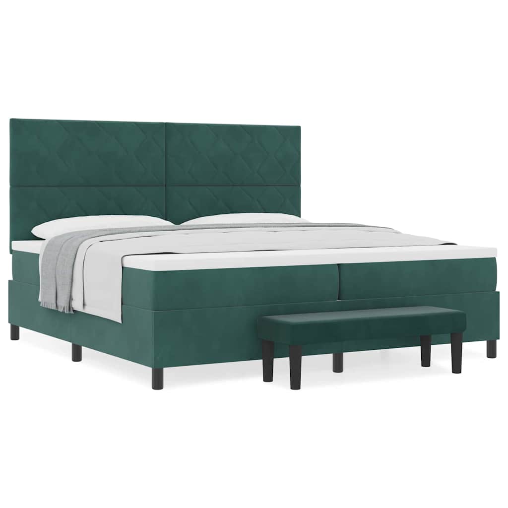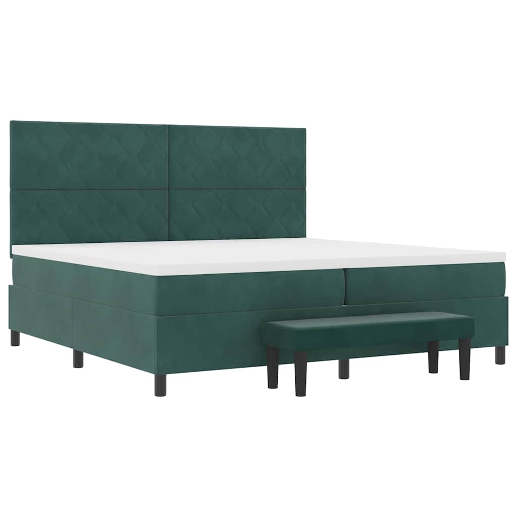Dit mooie boxspringbed in donkergroen is een fantastische slaapoplossing voor volwassenen die comfort en stijl willen in hun slaapkamer. De luxe fluwelen bekleding maakt het elegant, waardoor het een fijne plek is om te ontspannen en te slapen.