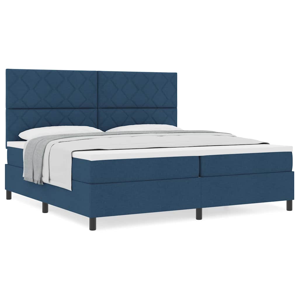 Dit boxspringbed brengt elegantie en praktisch gebruik samen, een topkeuze voor je slaapkamer. Met zijn marineblauwe geometrische stof en stevige houten poten, ziet het er niet alleen goed uit, maar is het ook comfortabel en betrouwbaar.