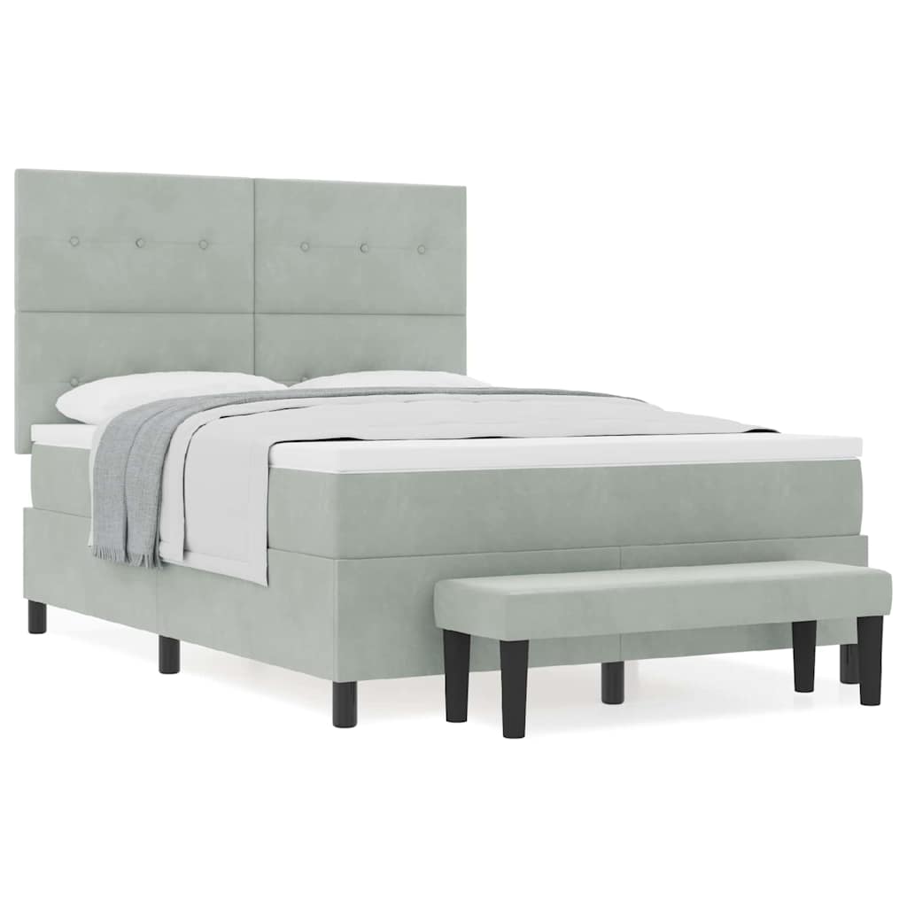 Dit toffe boxspringbed is een moderne slaapoplossing, ideaal voor volwassenen die een comfortabele en stijlvolle opstelling in hun slaapkamer willen. Met luxe lichtgrijze fluwelen bekleding, straalt het elegantie uit terwijl het een ontspannen ruimte creëert voor slaap en chilltijd.