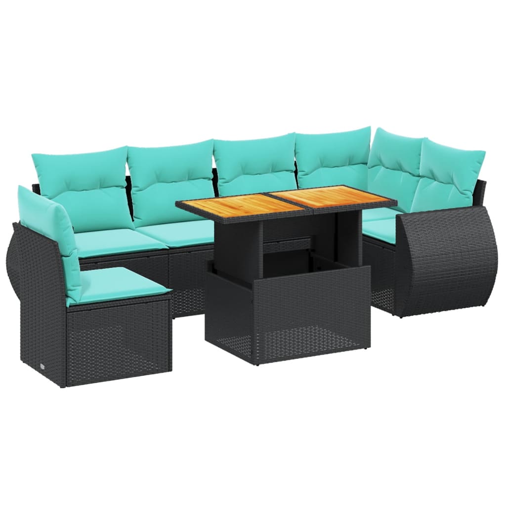 - Materiaal: PE-rattan, gepoedercoat staal en massief acaciahout met olieafwerking