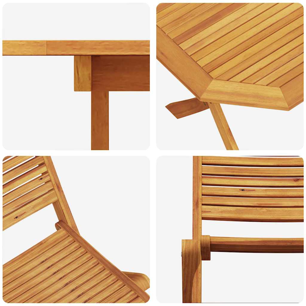 - Premium Acaciahout: De set is geconstrueerd met hoogwaardig acaciahout, dat bekend staat om zijn duurzaamheid en natuurlijke veerkracht tegen de elementen. Dit stevige materiaal biedt zowel kracht als warmte, en versterkt de rustieke charme van jouw buitenruimte. De rijke, geoliede afwerking beschermt niet alleen tegen vocht, maar benadrukt ook de natuurlijke nerf van het hout, wat zorgt voor esthetiek en lengte.