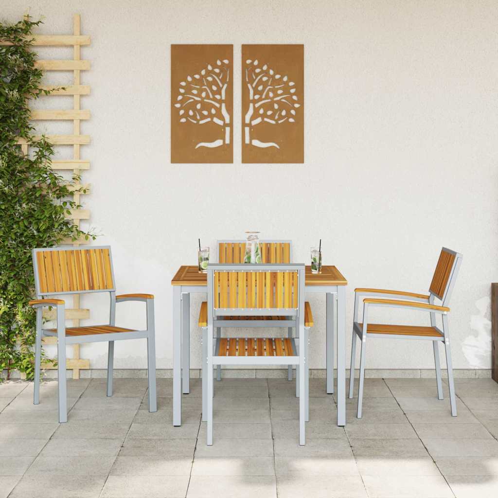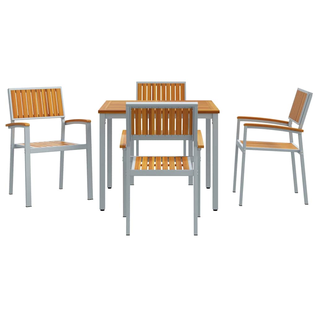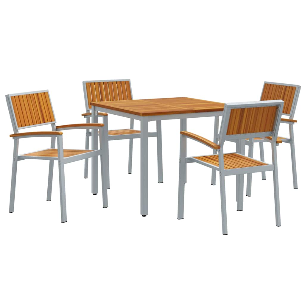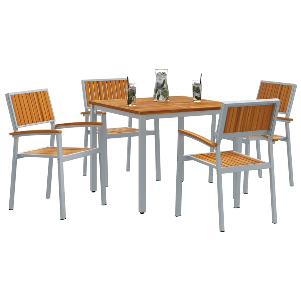 - Inbegrepen Componenten: De set bestaat uit een ruime tafel en comfortabele stoelen, elk met massief acaciahout armleuningen. Ze zijn ontworpen voor comfort en ondersteuning, zodat je gasten heerlijk achterover kunnen leunen en genieten van lange gesprekken.