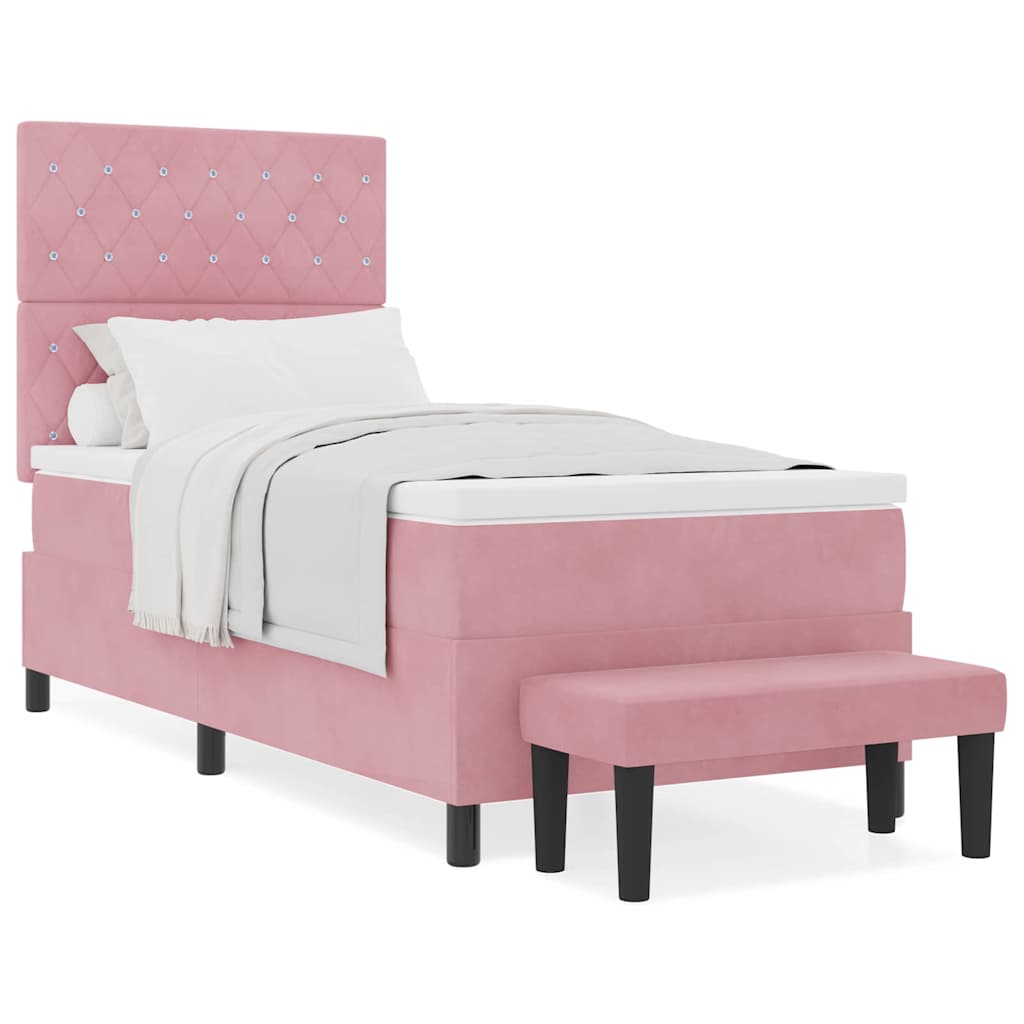 Dit mooie boxspringbed is een geweldige slaapoplossing, perfect voor volwassenen die zowel comfort als stijl willen. Met zijn zachte roze fluwelen bekleding ziet het er chique uit en biedt het een ruimte waar je mooi kunt relaxen en een dutje doen.