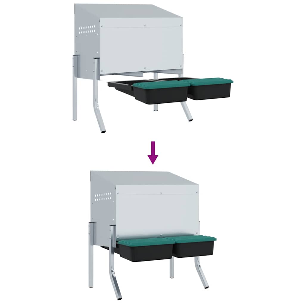 - Robuust en duurzaam materiaal: Gemaakt van gegalvaniseerd staal en stevig polypropyleen, is deze legkast gebouwd om lang mee te gaan. Hij biedt langdurige prestaties en bescherming voor uw kippen tegen barre weersomstandigheden.