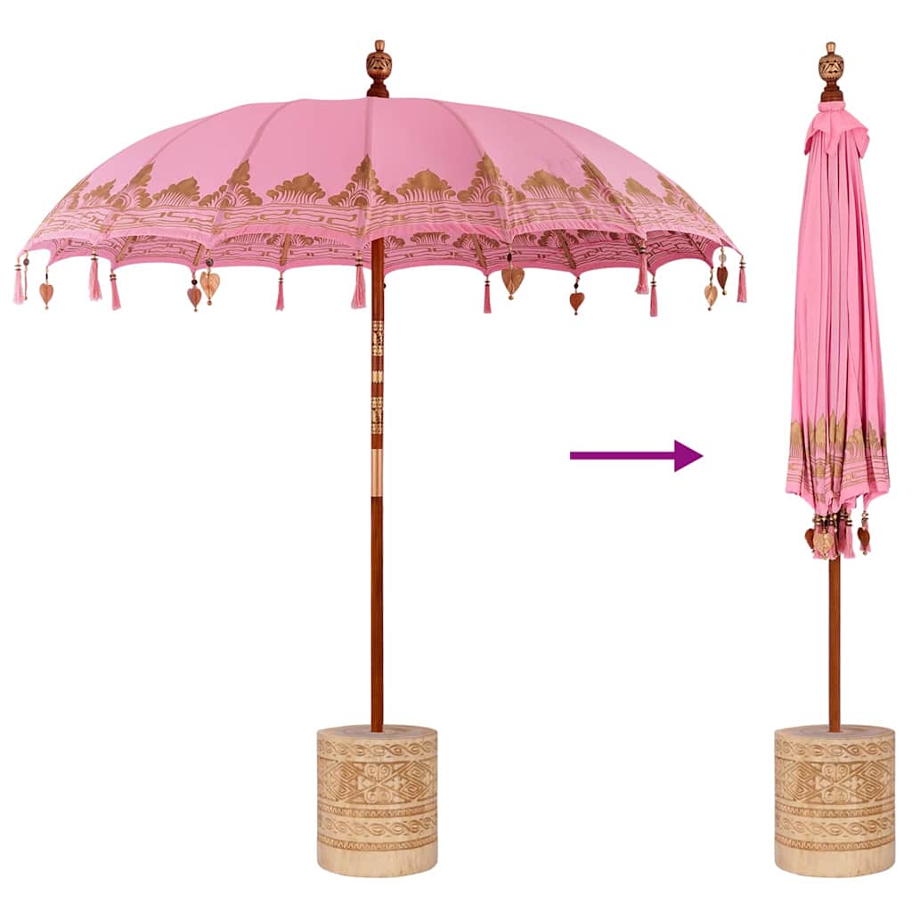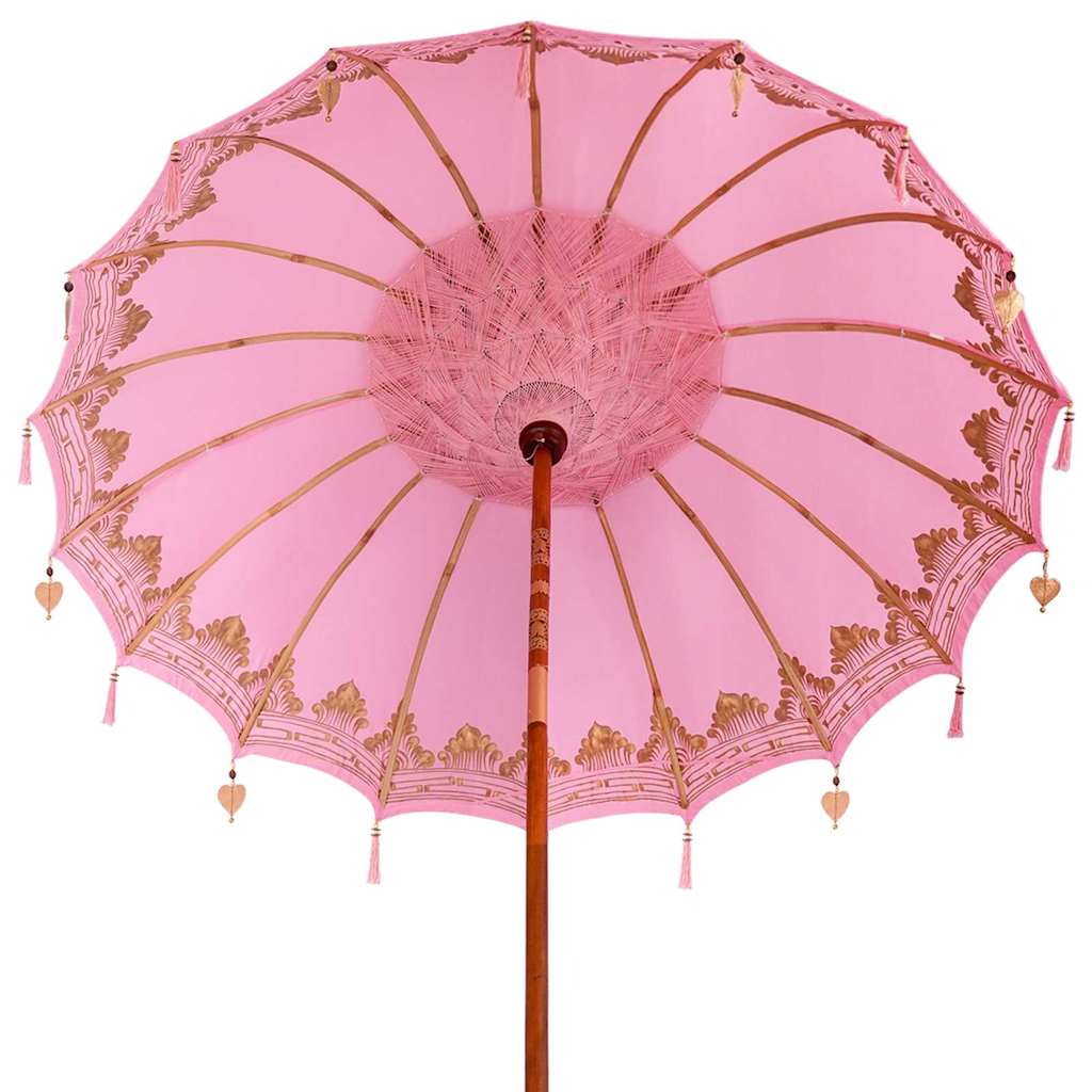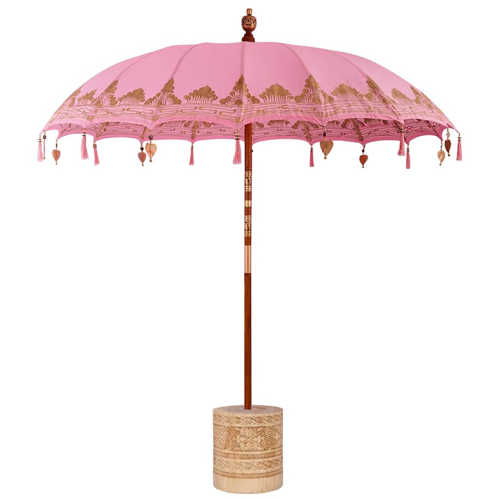 Deze Balinese Parasol is een prachtige zonneschaduw voor je tuin of terras. Met zijn kalmerende roze kleur en rustige Balinese stijl is deze grote parasol echt een hoogtepunt en brengt hij een vleugje eilandleven naar buiten. Perfect voor zomerdagen, de handgemaakte afwerking geeft het een persoonlijk tintje en nodigt je uit om in de schaduw te relaxen, of je nu alleen bent of met vrienden.