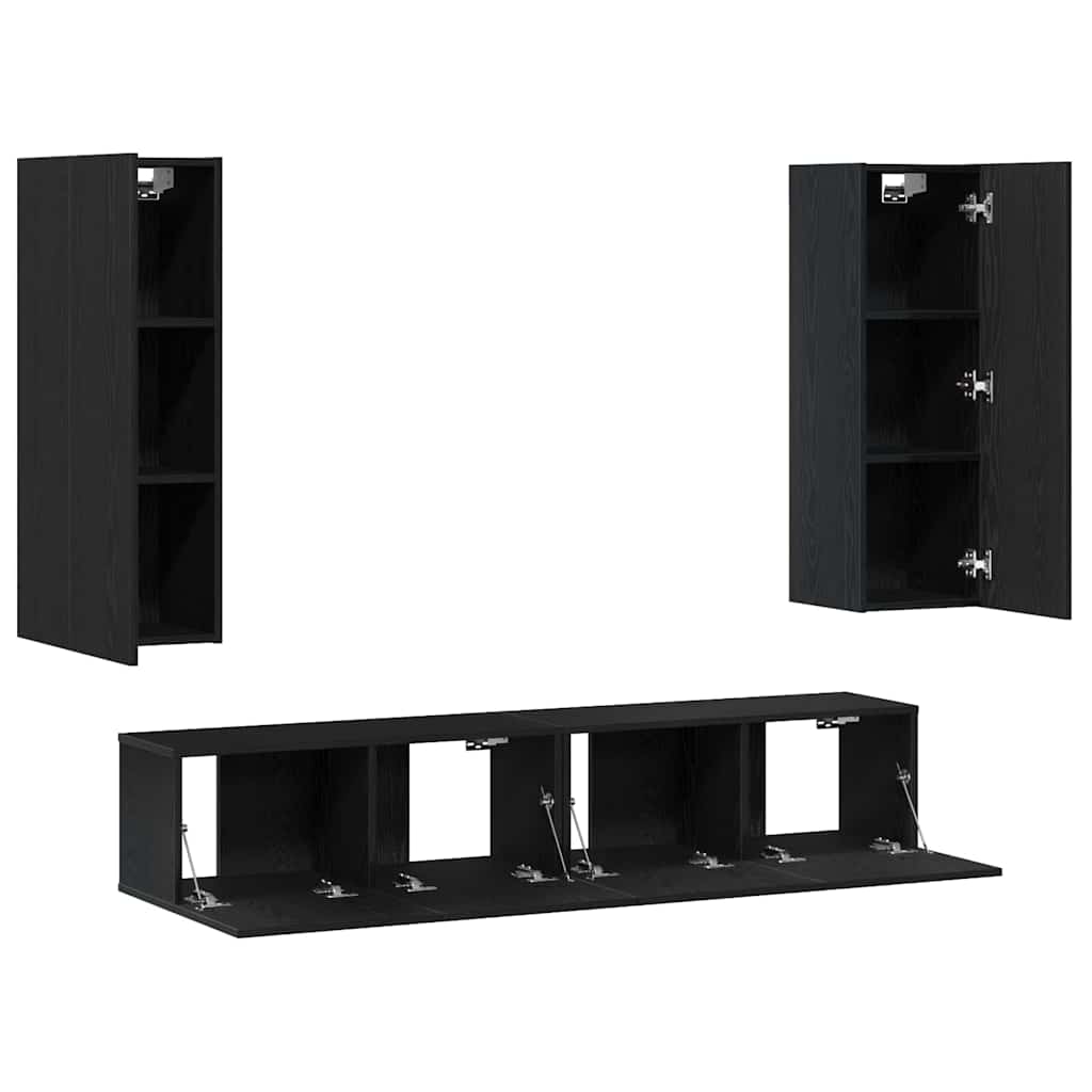 Deze TV-kast set combineert stijl met functionaliteit en biedt een chique oplossing voor je woonkamer. De strakke lijnen en gladde matte afwerking van het zwart eiken ontwerp geven het een moderne uitstraling, perfect voor hedendaagse woningen of minimalistische ruimtes.