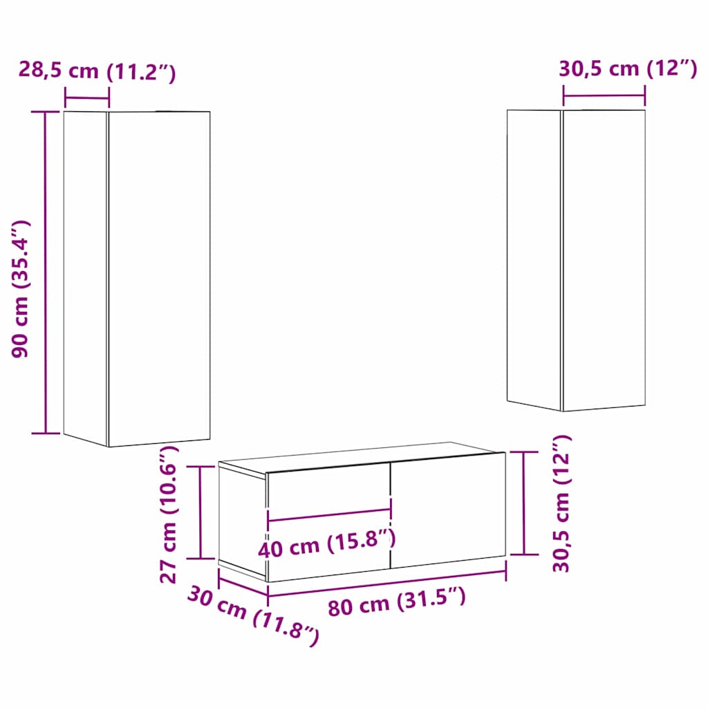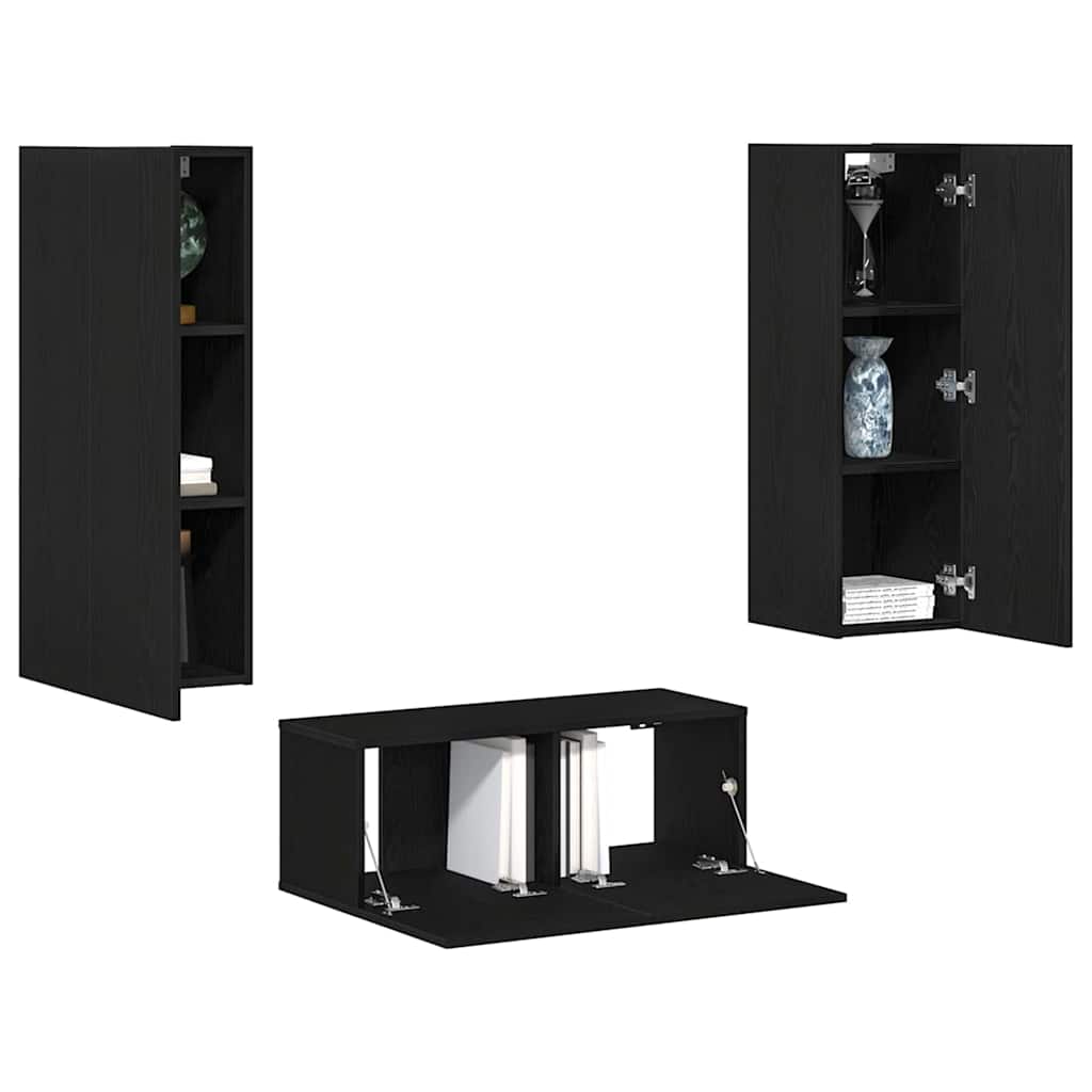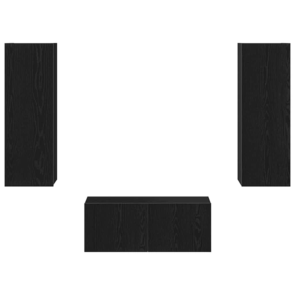 Deze TV-kastenset geeft je ruimte een moderne en minimalistische vibe. Met vier chique stukken in een opvallende zwart eiken afwerking creëert het extra opbergruimte en fungeert het ook als een stijlvol middelpunt. Geschikt voor alles van een buffet tijdens feesten tot het tentoonstellen van je favoriete decoraties, deze set is veelzijdig in gebruik.