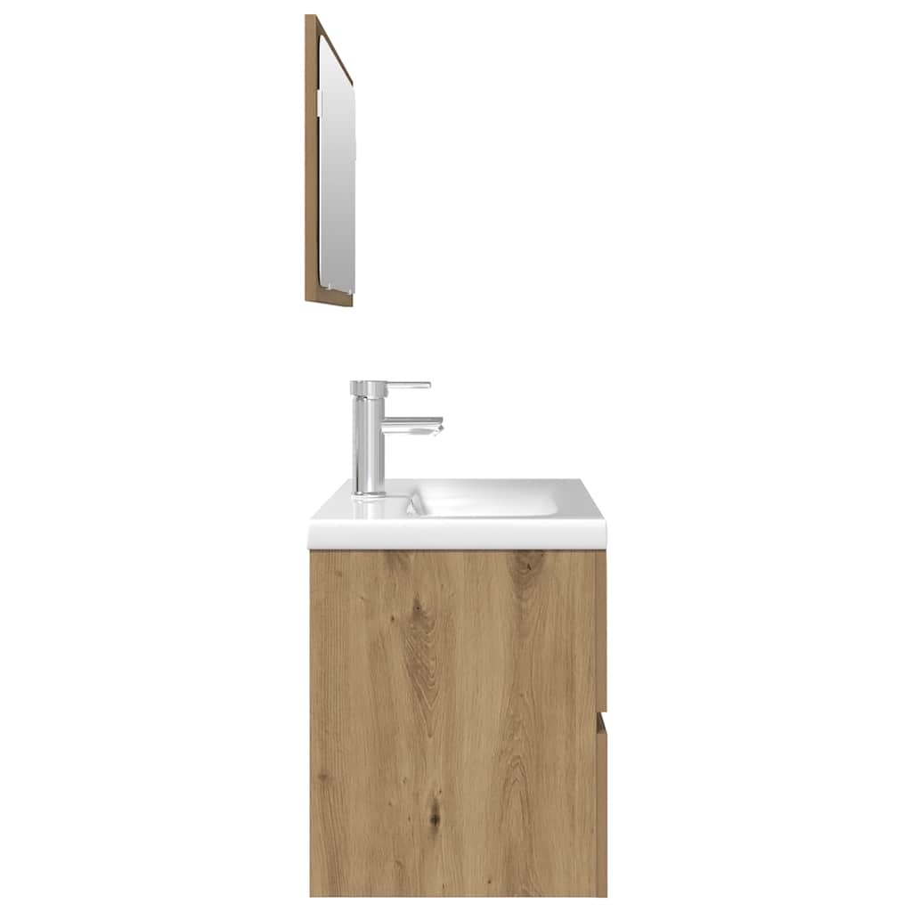 Deze trendy badkamermeubelset, bestaande uit een wastafelkast, een inbouwwastafel en een spiegel, past perfect bij je badkamer of wasruimte. Hij heeft een opvallende, opgeruimde uitstraling.
