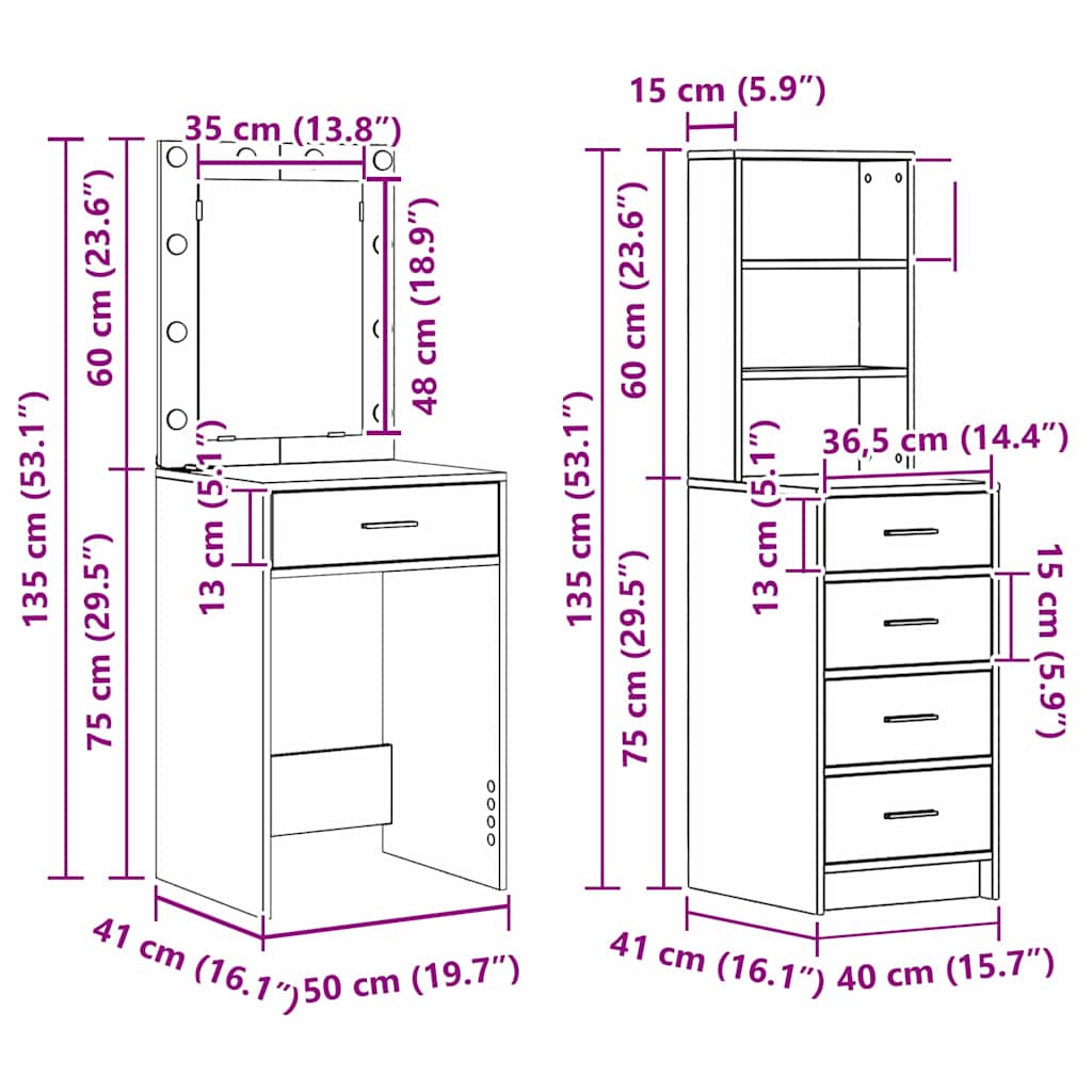 - Algemene afmetingen: 50 x 41 x 135 cm (L x B x H)