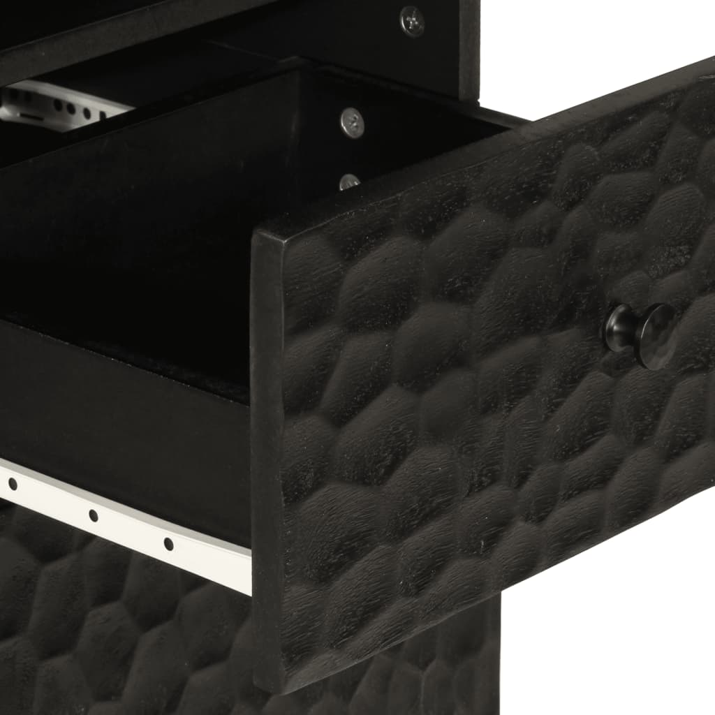 - Materiaal: massief mangohout met zwarte beits, bewerkt hout, ijzer, glas