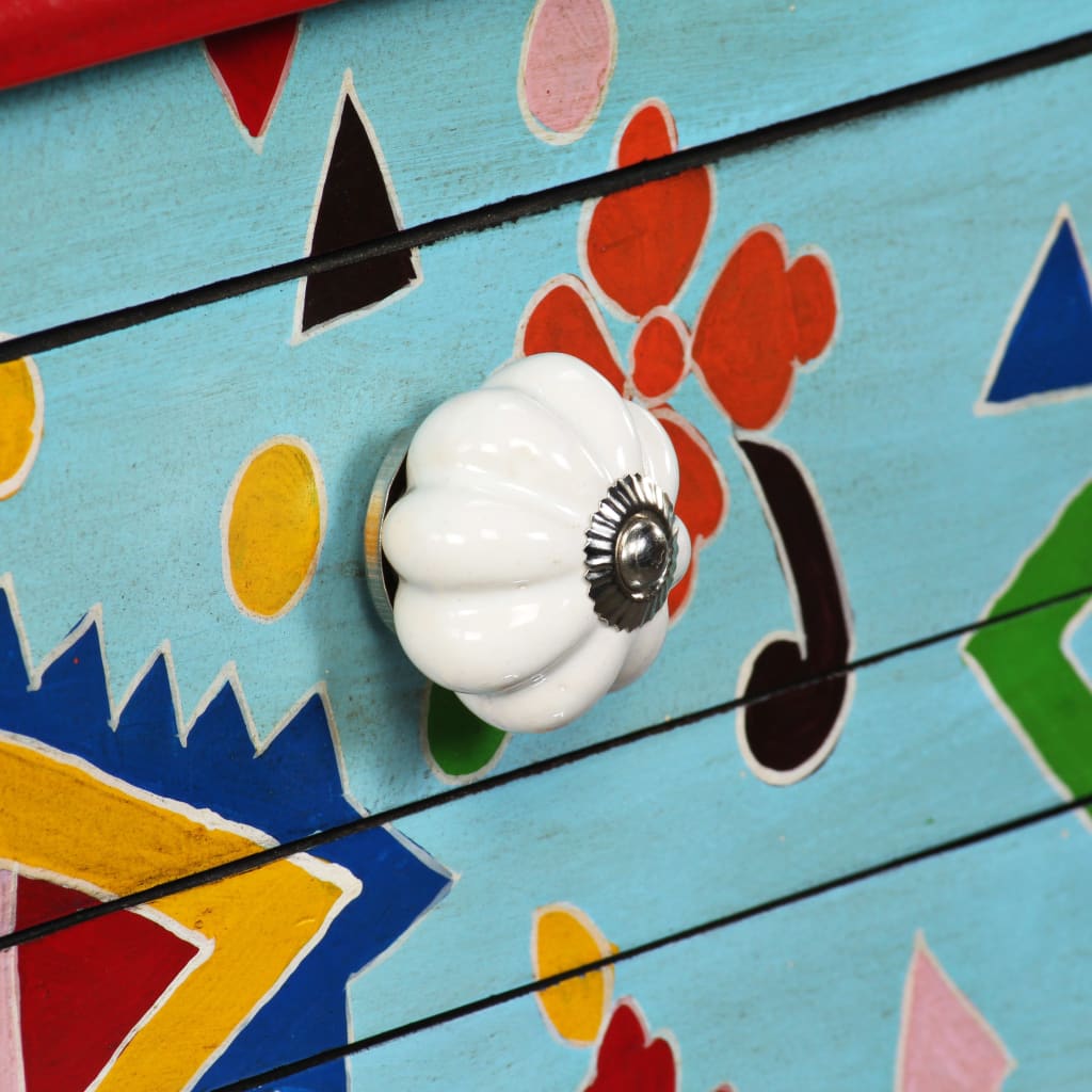 De tafel is handgemaakt van mangohout, wat zowel duurzaam als mooi is. Het vakmanschap draagt bij aan de spectaculaire retro-stijl. De tafel heeft mooie, handgeschilderde, decoratieve details die een vleugje elegantie uitstralen en de verfijnde uitstraling benadrukken. De opvallende knoppen maken het makkelijker om de lades te openen en dragen tevens bij aan de stijl van de tafel.