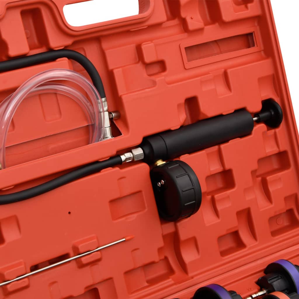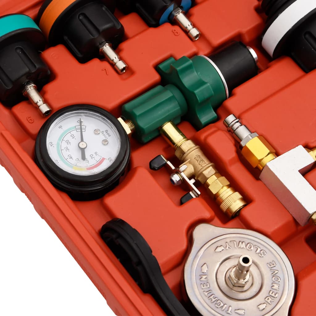 Deze gereedschapsset wordt gebruikt om eenvoudig de druk van een koelsysteem te testen en om gemakkelijk lekkages in watertanks te detecteren.