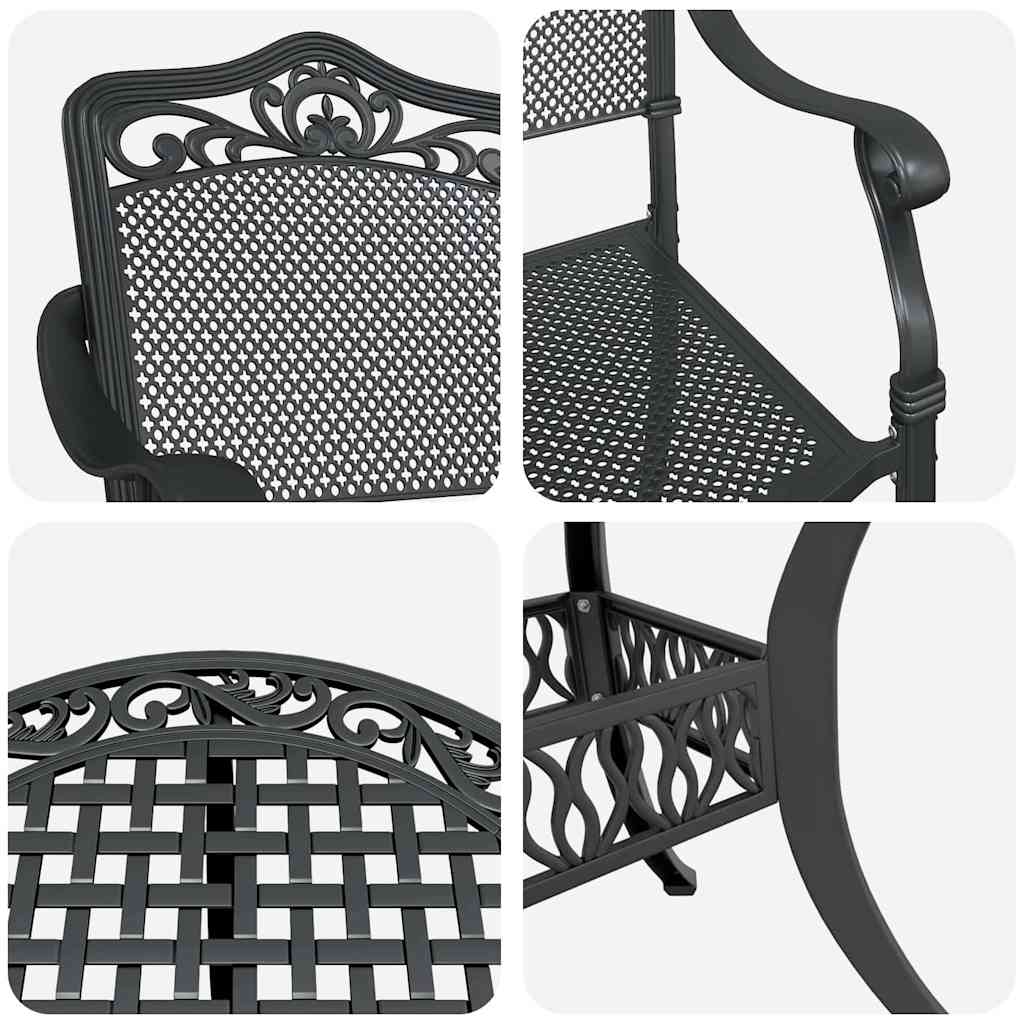 Deze mooie tuinset is gemaakt van sterk gegoten aluminium, wat het een klassieke look geeft die perfect past in je tuin of op je balkon. Het heeft klassieke details die wat verfijning meebrengen, waardoor het een prachtig middelpunt is voor buiten diners en bijeenkomsten in de lente en zomer. Stel je voor dat je gezellige avonden hebt met vrienden en familie, dineren onder de sterren, omringd door deze mooie mix van stijl en praktische gebruik!