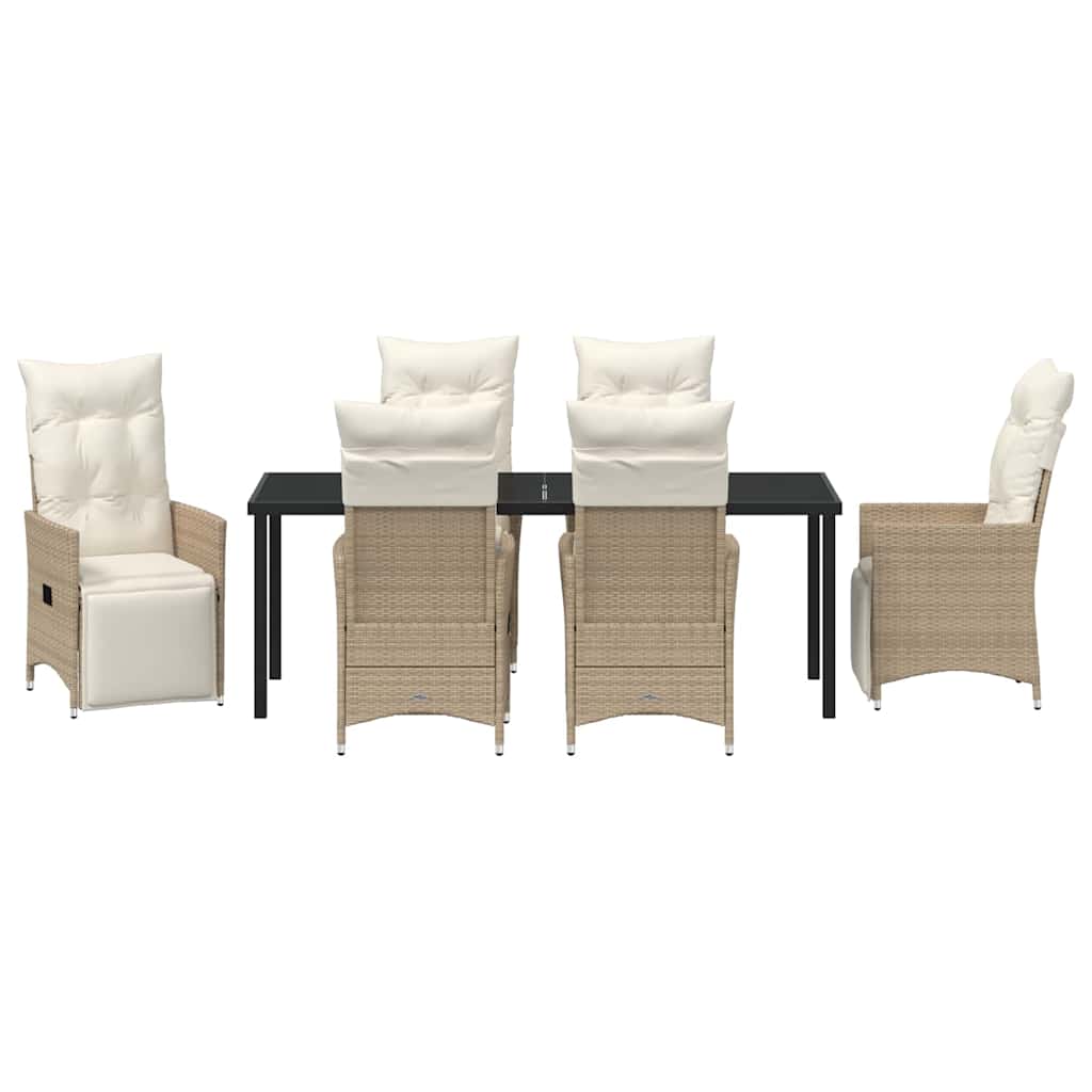 - Poly Rattan Textuur: Deze set is gemaakt van hoogwaardig poly rattan en heeft een geweven afwerking die zowel stijlvol als sterk is tegen UV-stralen en water. Het stevige materiaal zorgt ervoor dat het lang meegaat en er goed uitziet, ongeacht het weer.