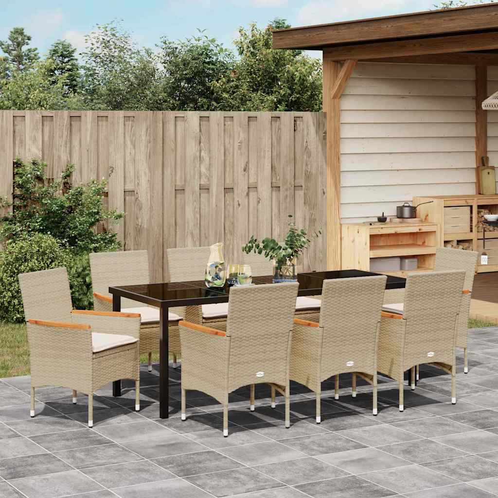 - Inbegrepen Onderdelen: Deze set komt met onderdelen zoals een glazen tafelblad dat mooi aansluit bij het geweven design. De comfortabele kussens zijn lekker dik voor extra gemak, en de stevige acaciahouten armleuningen geven een unieke touch - een slimme mix van stijl en functionaliteit voor een fijne ervaring.