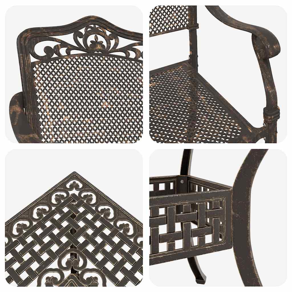 - Kwaliteitsmaterialen: Deze tuinset is gemaakt van gegoten aluminium en heeft een stevige, gestructureerde oppervlakte die fijn aanvoelt. De aluminiumconstructie is sterk genoeg voor buitengebruik, zodat hij jarenlang mooi blijft in elke tuin.