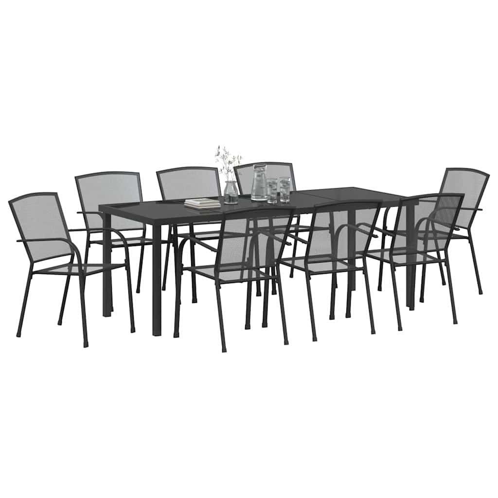 Premium Materialen: Gemaakt van gepoedercoat staal, de Tuin Eettafel Set is ontworpen voor langdurige duurzaamheid. Met UV-bescherming is deze stevige constructie gebouwd om de elementen buiten te weerstaan terwijl het zijn strakke uitstraling behoudt. Het gehard glazen oppervlak voegt een vleugje elegantie toe en biedt een betrouwbare en aantrekkelijke eetplek.,Slim Ontwerp: Elke stoel is stapelbaar, met oog voor zowel comfort als ruimtebeheer. Deze stoelen hebben ergonomische stalen rugleuningen voor extra ondersteuning, en de armleuningen zijn gecoat voor makkelijk ontspannen. Het solide stalen frame belooft stabiliteit, waardoor je erop kunt vertrouwen dat deze set vele memorabele buiten dineer ervaringen kan hosten.,Weerbestendigheid: Spendeer meer tijd met genieten van je tuin, wetende dat je meubels uitgerust zijn om de zwaarste stralen van de zomer te weerstaan. Het UV-bestendige staal en de poedercoating beschermen tegen vervaging en slijtage, zodat je kunt genieten van een product dat er door meer dan één seizoen goed uitziet.,Sophisticated Stijl: Dankzij het eigentijdse ontwerp, verbetert deze set buitenruimtes, met een moderne flair die de sfeer verhoogt. Het antraciet kleurenschema zorgt ervoor dat het naadloos mengt met verschillende decors, waardoor veelzijdigheid geboden wordt zonder in te boeten op stijl.,Eenvoudig Onderhoud: Het schoonhouden van de Tuin Eettafel Set is moeiteloos. Bedek je meubels wanneer ze niet in gebruik zijn of tijdens slecht weer voor optimaal onderhoud. Er zijn geen agressieve chemicaliën nodig; gewoon de oppervlakken afvegen wanneer nodig om alles te laten glanzen.- Kleur: Antraciet