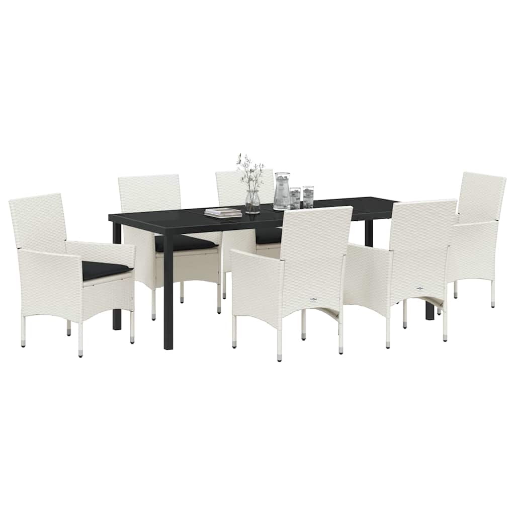 - Geweven Poly Rattan: De set heeft een fijn geweven poly rattan textuur die niet alleen een vleugje elegantie toevoegt, maar ook de duurzaamheid vergroot. Poly rattan is gekozen om zijn uitzonderlijke weerstand tegen UV-stralen en weersomstandigheden, zodat de eetset levendig en intact blijft, zelfs bij langdurige blootstelling aan de buitenlucht.
