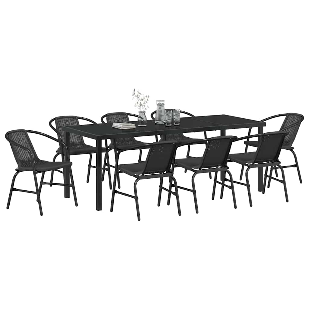 Deze moderne tuinset biedt een slanke en moderne optie voor jouw buitenruimte. Ontworpen met de nieuwste in gedachten, spreekt het degenen aan die een frisse, stijlvolle sfeer in hun tuin of op hun terras waarderen. Met een slimme zwarte afwerking, verbeterd deze set moeiteloos elke buiteninrichting en belichaamt het een chique aura die zowel casual bijeenkomsten als elegante diners bedient. Het veelzijdige ontwerp maakt het ideaal voor het organiseren van zomerse maaltijden, ontspannen met een ochtendkoffie, of genieten van een rustige avond onder de sterren.