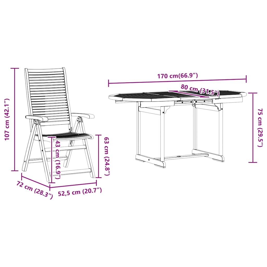 - Functies / Functionaliteit / Ontwerp: Deze inklapbare eetset is perfect voor wie de ruimte op hun terras of in de tuin wil maximaliseren. De handmatige aanpassing maakt het makkelijk om de onderdelen op te vouwen, wat perfect is voor compacte opslag zonder in te boeten op de uitnodigende uitstraling van de rustieke stijl.