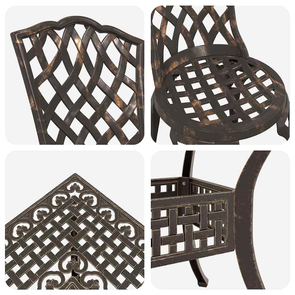 - Kwaliteitsmaterialen: Deze tuinset is gemaakt van gegoten aluminium en heeft een stevige, gestructureerde oppervlakte die fijn aanvoelt. De aluminiumconstructie is sterk genoeg voor buitengebruik, zodat hij jarenlang mooi blijft in elke tuin.