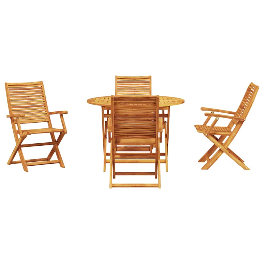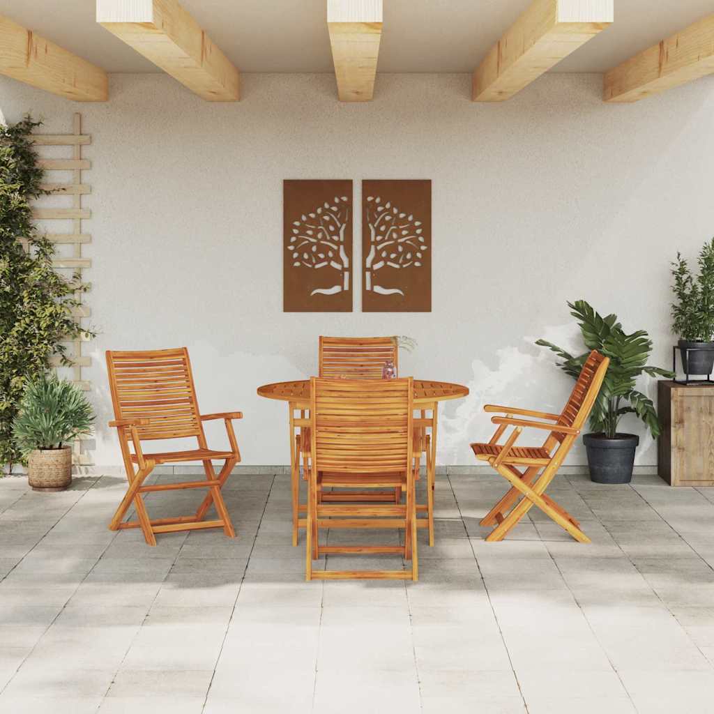 - Inclusief componenten: De set bevat één stevige tafel en vier bijpassende stoelen, elk gekenmerkt door hun robuuste acaciahouten constructie. De stoelen hebben een afgewerkte rug, wat zorgt voor een aantrekkelijke aanblik vanuit elke hoek, terwijl de tafel een ruime oppervlakte biedt voor het diner.