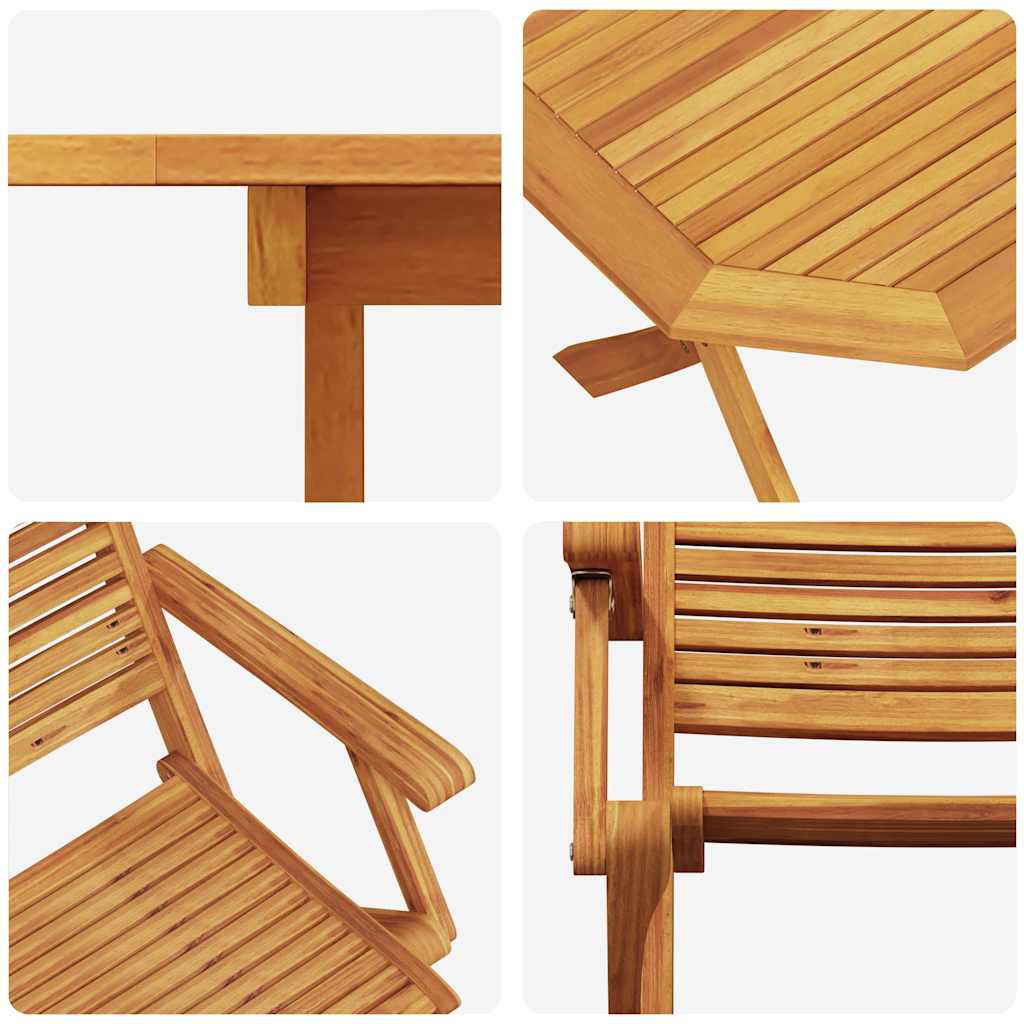 - Premium Acaciahout: De set is geconstrueerd met hoogwaardig acaciahout, dat bekend staat om zijn duurzaamheid en natuurlijke veerkracht tegen de elementen. Dit stevige materiaal biedt zowel kracht als warmte, en versterkt de rustieke charme van jouw buitenruimte. De rijke, geoliede afwerking beschermt niet alleen tegen vocht, maar benadrukt ook de natuurlijke nerf van het hout, wat zorgt voor esthetiek en lengte.
