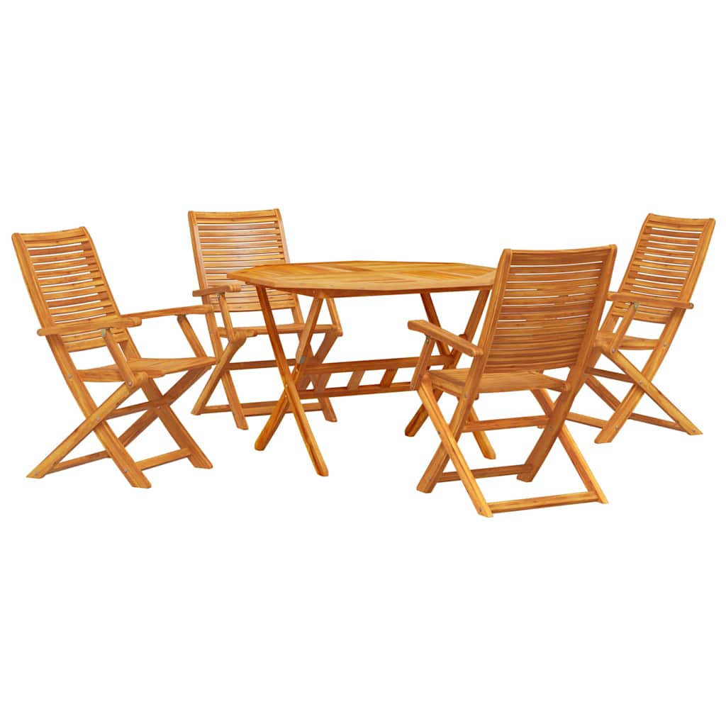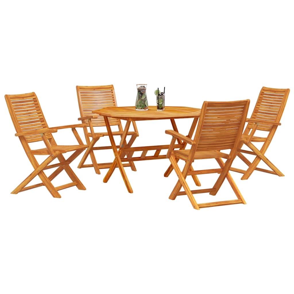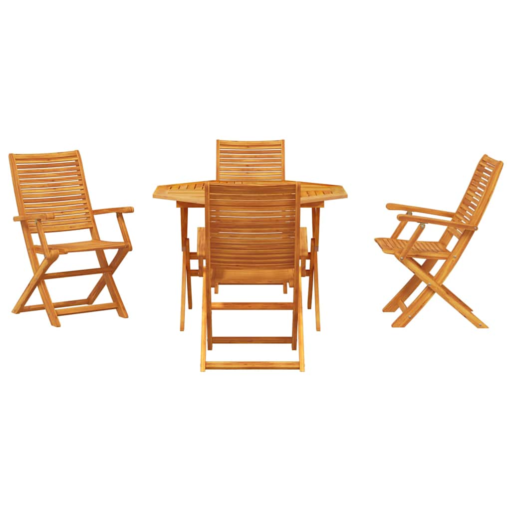 - Inclusief componenten: De set bevat één stevige tafel en vier bijpassende stoelen, elk gekenmerkt door hun robuuste acaciahouten constructie. De stoelen hebben een afgewerkte rug, wat zorgt voor een aantrekkelijke aanblik vanuit elke hoek, terwijl de tafel een ruime oppervlakte biedt voor het diner.