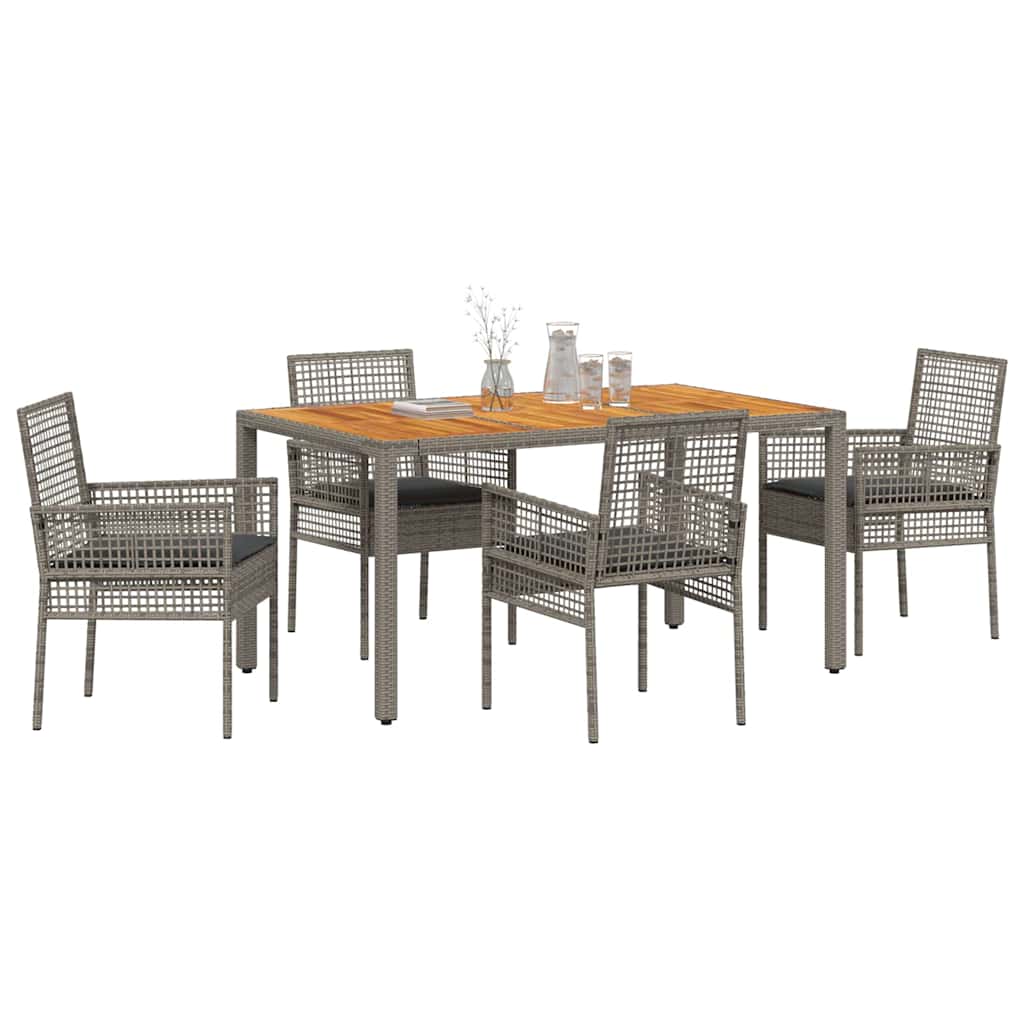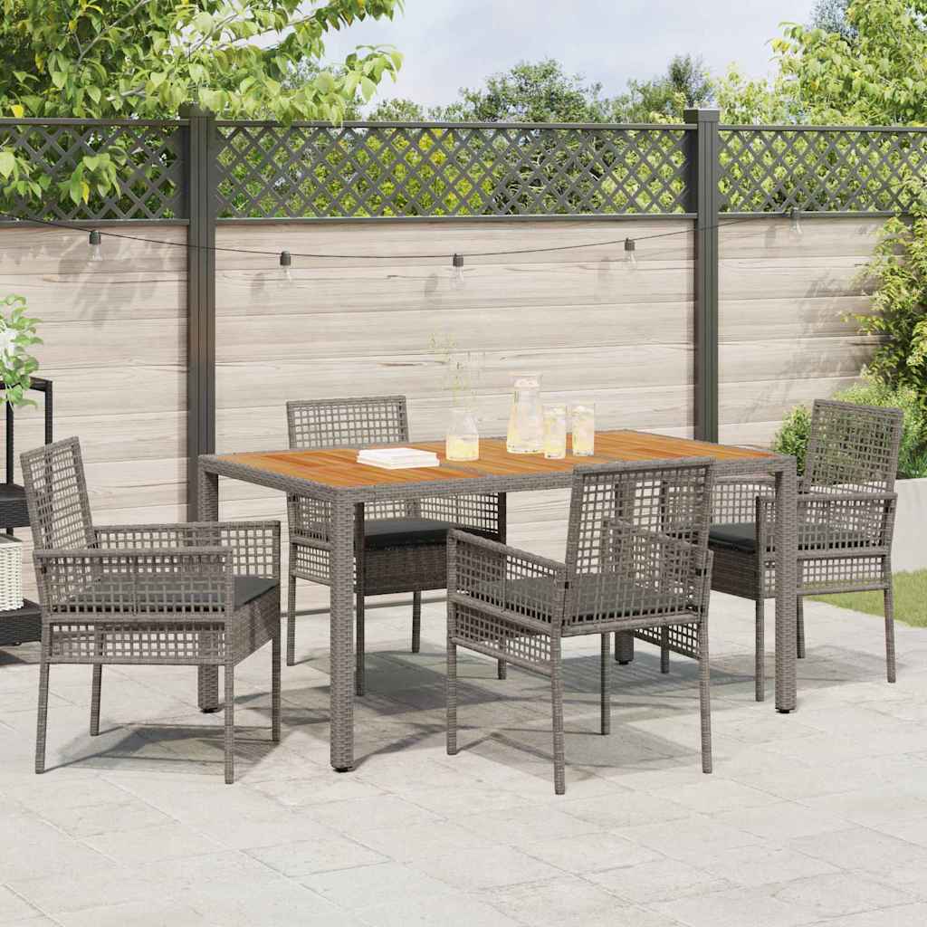 - Inclusief Componenten: De set bevat een grote tafel met een stevige poly rattan bovenkant, die genoeg ruimte biedt voor maaltijden en leuke momenten. Elke stoel is ontworpen voor comfort, zodat je lange uren met vrienden en familie kunt genieten. De stukken passen goed bij elkaar, en zorgen voor zowel stijl als functionaliteit in je buiten eetplek.