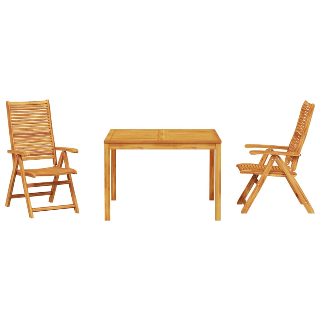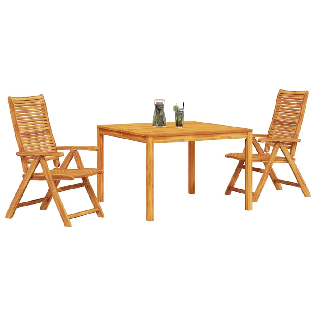 - Materialen: Gemaakt van massief acaciahout, benadrukt deze eetset de natuurlijke schoonheid van het materiaal terwijl het robuustheid en stabiliteit biedt voor alle buitengebruik. Acaciahout is bekend om zijn UV-bestendige eigenschappen, wat ervoor zorgt dat de set zijn uiterlijk behoudt onder zonneschijn, waardoor het een betrouwbare en aantrekkelijke keuze is voor buitenbijeenkomsten.