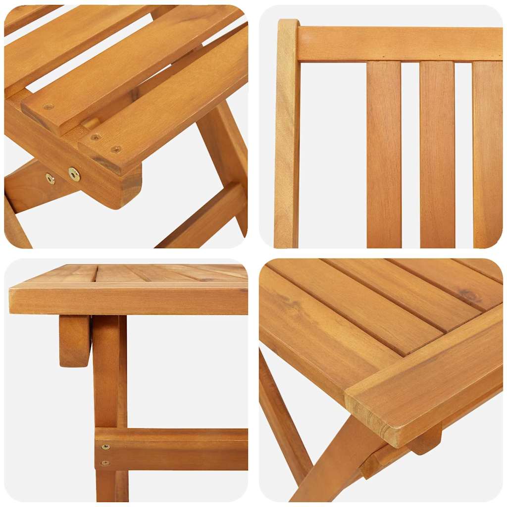 - Materiaal: Deze bistroset is gemaakt van massief acaciahout, wat bekend staat om zijn duurzaamheid, vooral buiten. De natuurlijke houtnerfafwerking heeft een rustieke charme en voegt een vleugje elegantie toe zonder praktisch gebruik te verliezen. Het hout blijft mooi door de seizoenen heen, zodat het zijn aantrekkingskracht behoudt in de lente en zomer.