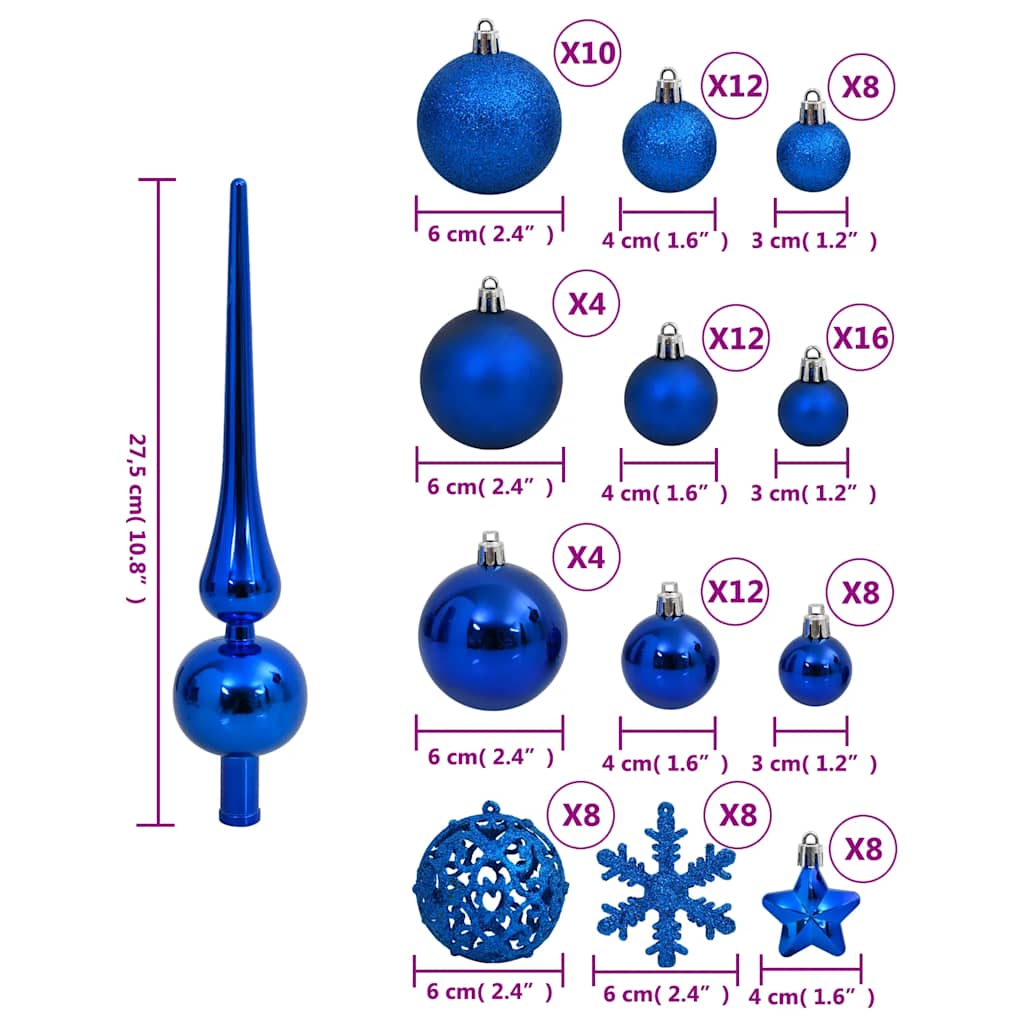 - Verschillende stijlen en maten: deze collectie kerstballen bevat ballen met 3 verschillende diameters (3 cm, 4 cm en 6 cm), sneeuwvlokken, sterren en een piek. Deze ballen hebben 4 stijlen (mat, glitter, glanzend en opengewerkt).