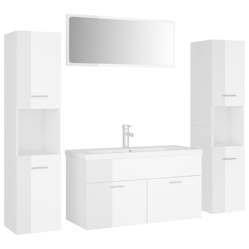 De meubelset bestaat uit een wastafelkast, 2 hoge kasten, een inbouwwastafel en een spiegel. De chique wastafelkast heeft 1 vak en het blad is perfect voor het plaatsen van je wastafel. Elke hoge kast heeft in totaal 5 vakken en 2 deuren, waardoor er voldoende ruimte is om spullen in je badkamer op te bergen. De wastafel is gemaakt van keramiek en dient niet alleen als product voor dagelijks gebruik, maar ook als versiering in je leefruimte. Dankzij zijn trendy en eigentijdse ontwerp past deze wastafel beslist in elk interieur. De overloop zorgt ervoor dat de bak nooit kan overlopen. De spiegel geeft je interieur een prachtige uitstraling. Deze badkamerset is gemakkelijk schoon te maken met een vochtige doek.