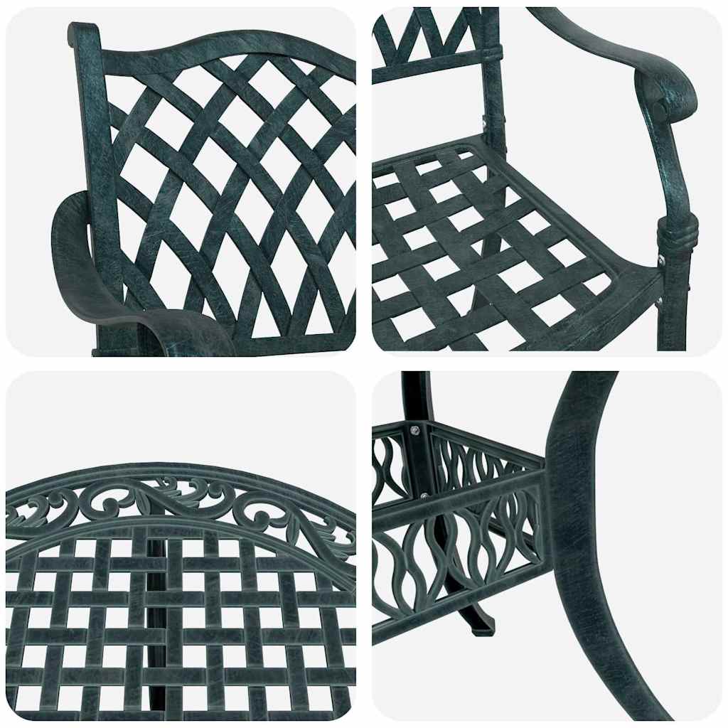 Deze mooie tuinset is gemaakt van sterk gegoten aluminium, wat het een klassieke look geeft die perfect past in je tuin of op je balkon. Het heeft klassieke details die wat verfijning meebrengen, waardoor het een prachtig middelpunt is voor buiten diners en bijeenkomsten in de lente en zomer. Stel je voor dat je gezellige avonden hebt met vrienden en familie, dineren onder de sterren, omringd door deze mooie mix van stijl en praktische gebruik!
