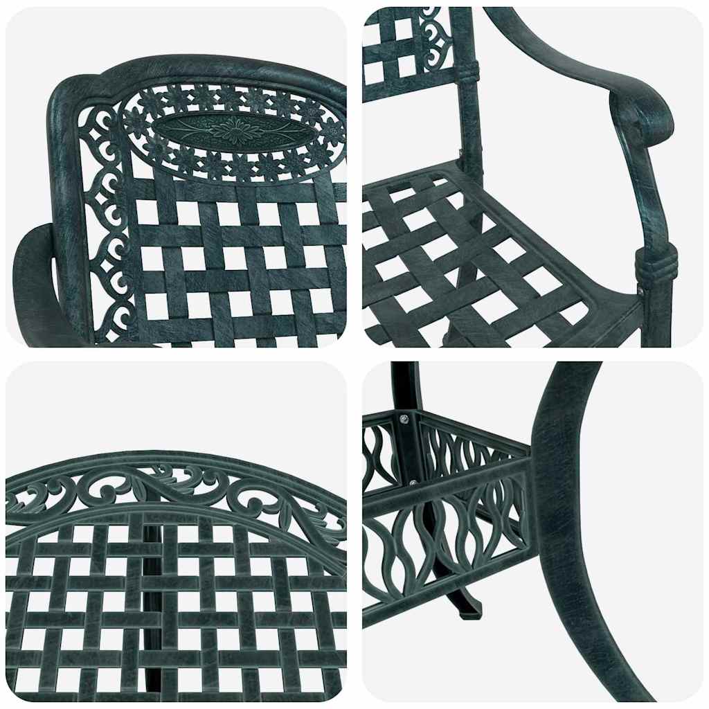 Deze mooie tuinset is gemaakt van sterk gegoten aluminium, wat het een klassieke look geeft die perfect past in je tuin of op je balkon. Het heeft klassieke details die wat verfijning meebrengen, waardoor het een prachtig middelpunt is voor buiten diners en bijeenkomsten in de lente en zomer. Stel je voor dat je gezellige avonden hebt met vrienden en familie, dineren onder de sterren, omringd door deze mooie mix van stijl en praktische gebruik!