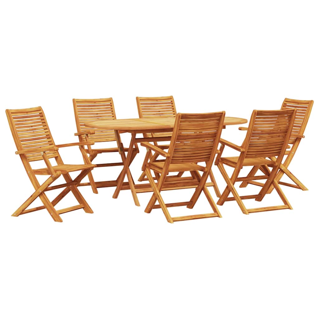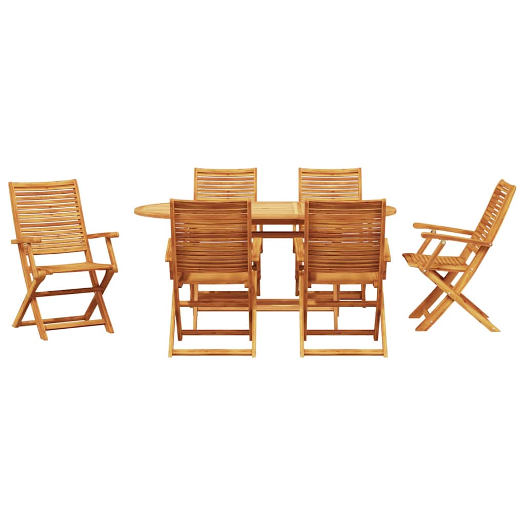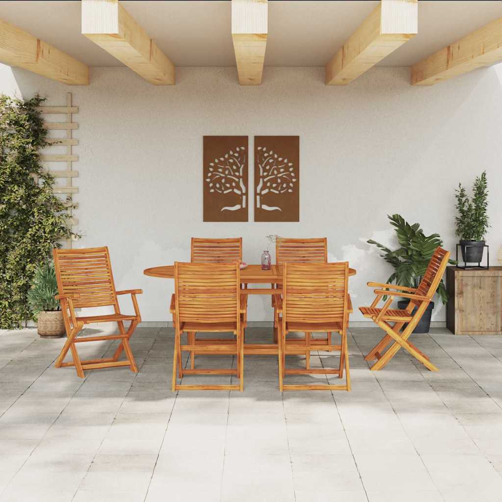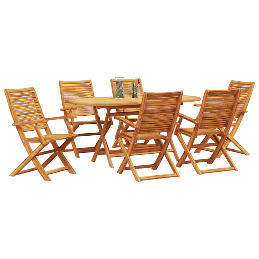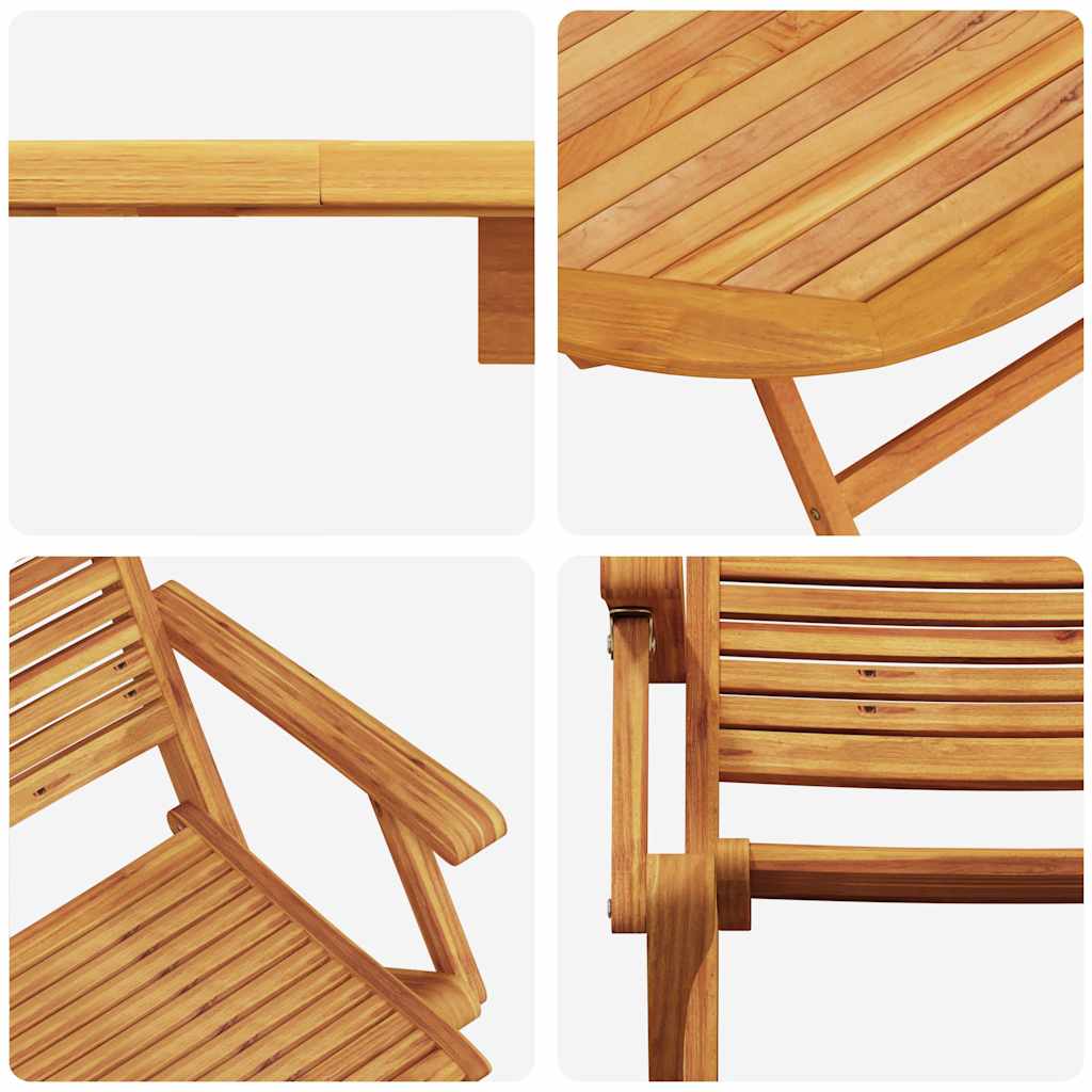 - Functionele componenten: De tuinset omvat een veelzijdige ovale tafel en ergonomische stoelen met comfortabele rugsteun. Elk onderdeel, samengesteld uit duurzaam acaciahout, is ontworpen om elke buitenervaring te verrijken, met garantie voor comfort en stijl.