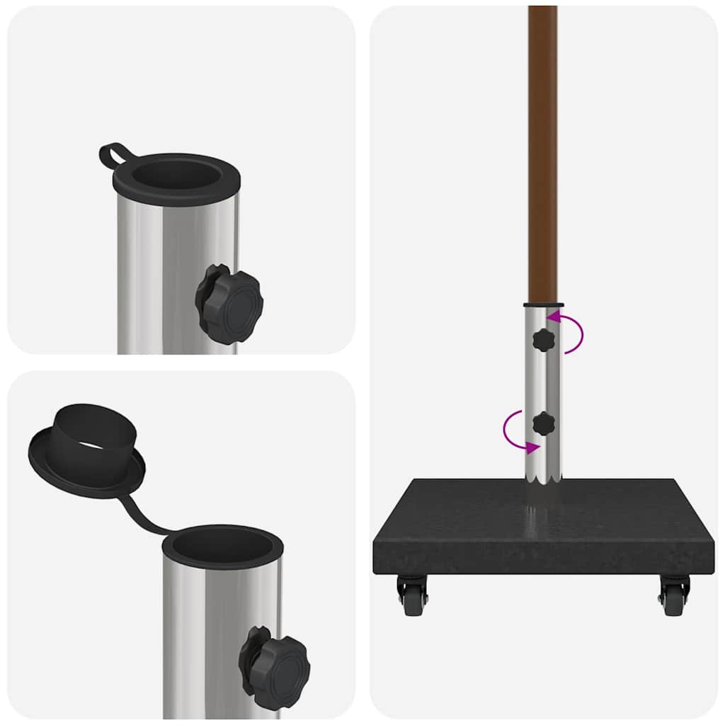 - Functioneel ontwerp met wielen Dankzij de ingebouwde wielen verplaatst deze voet makkelijk over verschillende oppervlakken. Zo kun je je parasol precies plaatsen waar je de schaduw wilt, zonder gedoe, en creëer je een persoonlijke buitenplek.