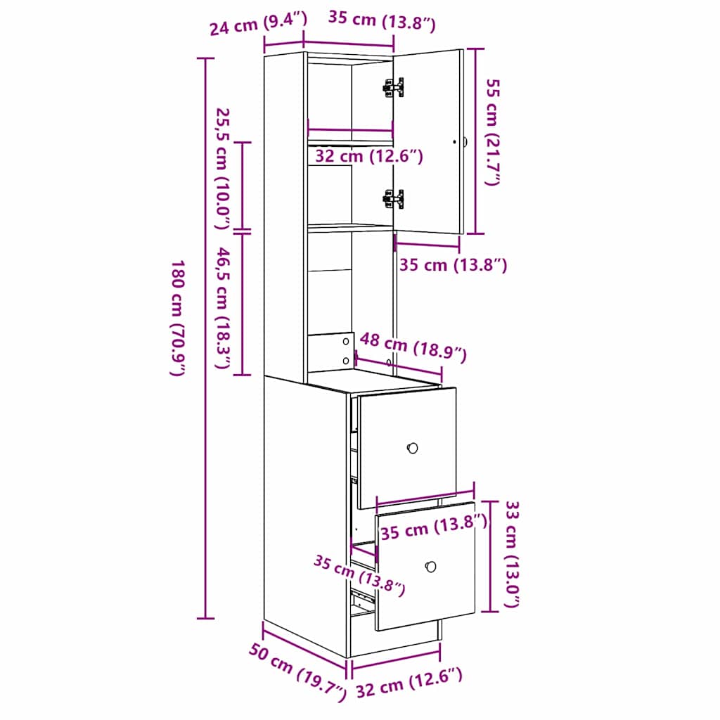 - Algemene afmetingen: 35 x 50 x 180 cm (L x B x H)