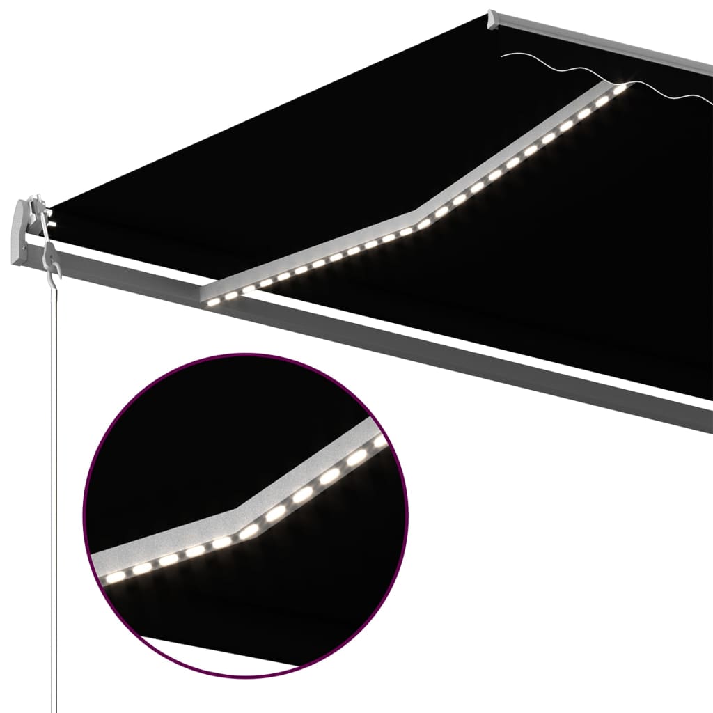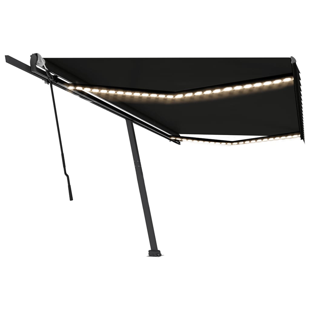 Deze buitenluifel heeft een roestbestendig, gepoedercoat aluminium frame waardoor hij lichtgewicht en toch stevig is. Het zonnescherm is gemaakt van polyester met een hoge dichtheid en een PU-coating, waardoor het uv- en waterbestendig is. De hoek en hoogte kunnen worden aangepast aan je specifieke behoeften. Je kan de luifel openen en intrekken met de lange handslinger. De solar LED''s bieden je ''s nachts energie-efficiënte verlichting. De stevige basis kan 360 graden draaien voor maximale verstelbaarheid.