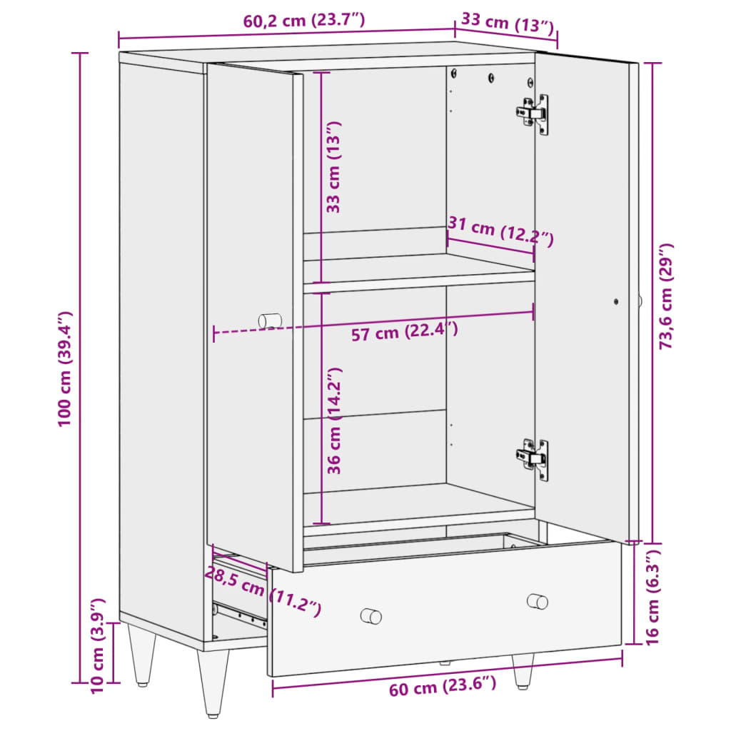 - Afmetingen: 60 x 33 x 100 cm (B x D x H)