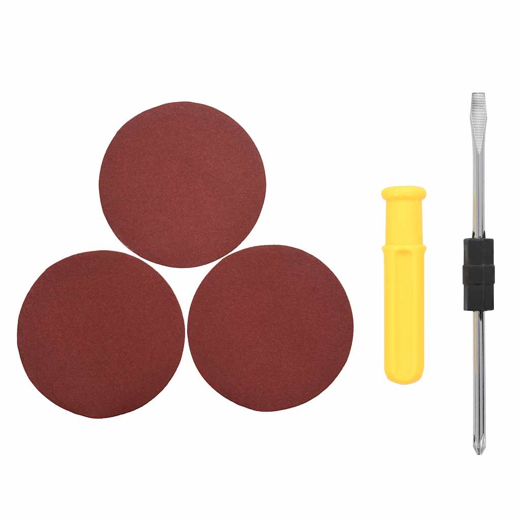 Een kunststof schijf, een sponsschijf, 3 schuurschijven, een paar koolborstels en een tweeledige schroevendraaier worden ook meegeleverd.