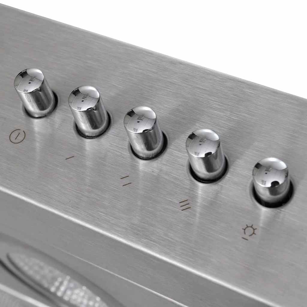 Hij beschikt over een 720 m³/uur afzuiger, drie wasbare aluminium vetfilters en een inwendig ventilatiegat. De 2 geïntegreerde LED-lampjes verlichten het kookgebied eronder. De hoogte van de schoorsteen kan worden versteld van 400 mm tot 700 mm, al gelang de vereisten. Hij is uitgerust met 5 drukknoppen waarmee je de afzuigkap gemakkelijk kunt bedienen.