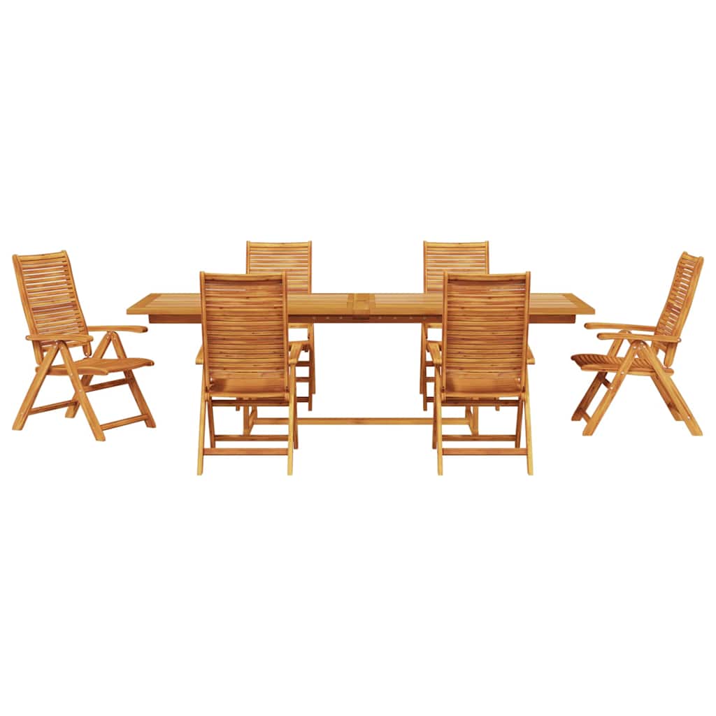 - Gemaakt van Massief Acaciahout Elk stuk in de eetset is gemaakt van massief acaciahout, bekend om zijn sterkte en weerstand tegen weersomstandigheden. De geoliede afwerking versterkt de natuurlijke bruine kleur en biedt een beschermende laag tegen vocht. Dit zorgt ervoor dat de set robuust en visueel aantrekkelijk blijft in de loop der tijd, perfect passend bij een rustiek tuinthema.