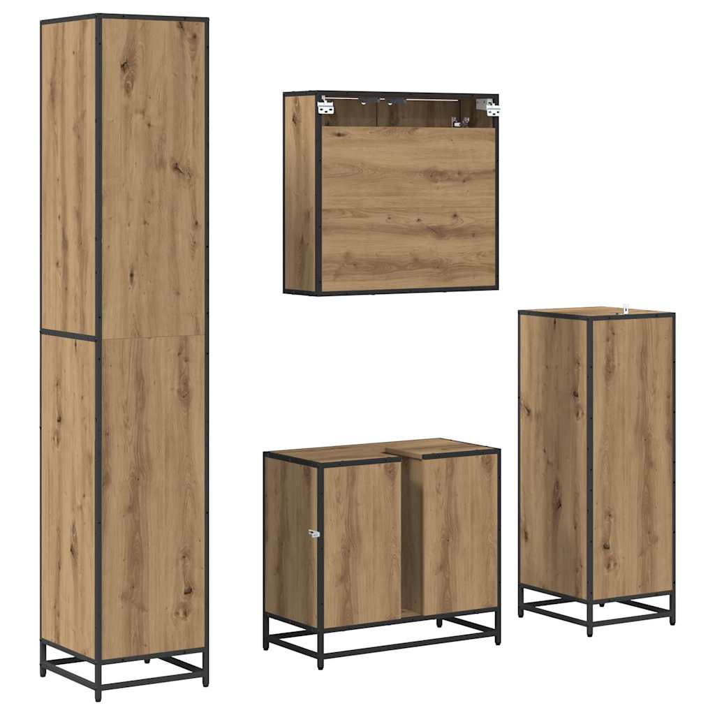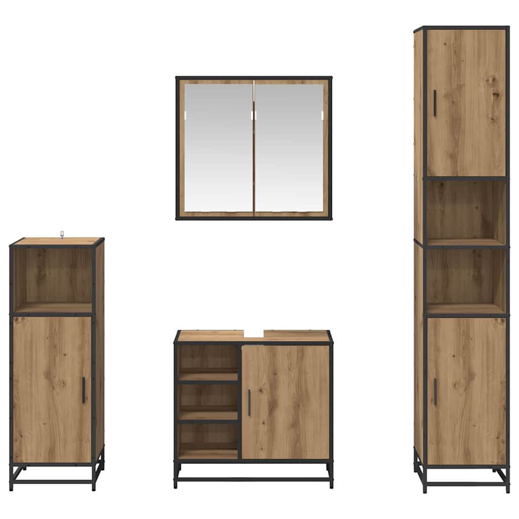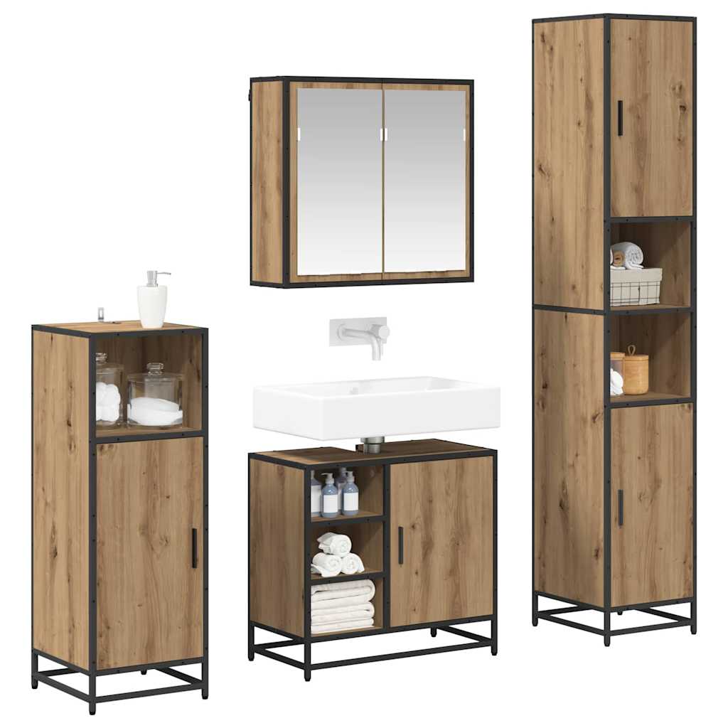 - Functionele Componenten De set komt inclusief een spiegelkast, wastafelmeubel en twee extra kasten, wat zorgt voor praktische opbergoplossingen in de badkamer. De vlakke spiegel is handig voor persoonlijke verzorging en geeft diepte aan de ruimte, terwijl het wastafelmeubel netjes de leidingen verbergt, waardoor alles opgeruimd blijft.