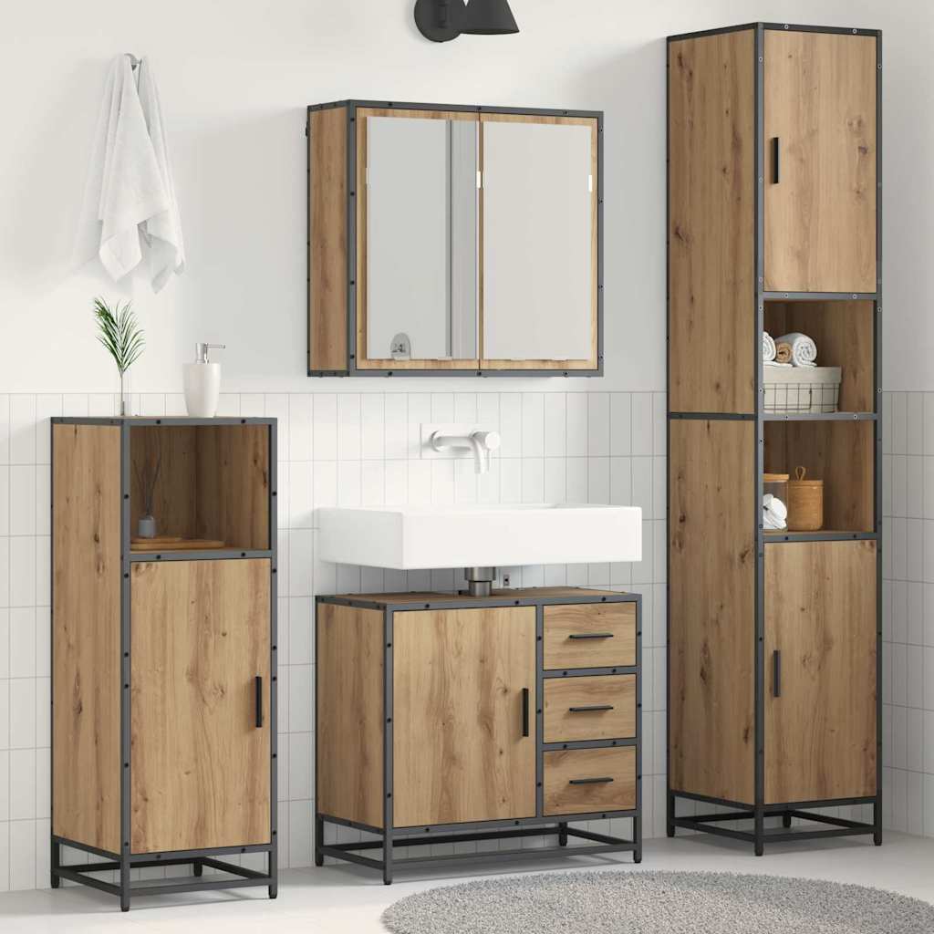 Deze houten badkamermeubelset is een prachtig gemaakte oplossing om je badkamer op te ruimen en te verbeteren. Met een modern ontwerp, kenmerkend door strakke lijnen en weinig poespas, biedt deze set stijl en functionaliteit. Het bevat de belangrijkste onderdelen - een spiegelkast, een wastafel en een extra opbergkast - zodat je een mooie, samenhangende look hebt met genoeg plek voor al je dagelijkse spullen. De elegante zwarte metalen details passen mooi bij het bewerkte hout en maken het geheel aantrekkelijker. Ideaal voor zowel moderne als minimalistische ruimtes, past deze set perfect in verschillende badkamerstijlen, zodat je een opgeruimde en georganiseerde omgeving hebt.