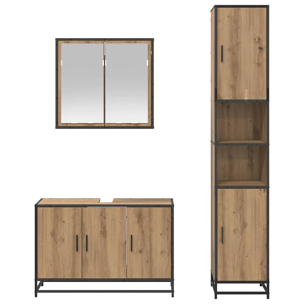 Deze houten badkamermeubelset heeft een toffe moderne uitstraling en is precies wat je nodig hebt om elke badkamer op te fleuren. Hij is gemaakt van gefabriceerd hout en metaal en komt met een spiegelkast, wasmeubel en een extra opbergkast. Met zijn simpele elegantie en praktische ontwerp is het perfect voor moderne woningen en minimalistische stijlen. Ideaal om het meeste uit de badkamer te halen terwijl alles netjes blijft.