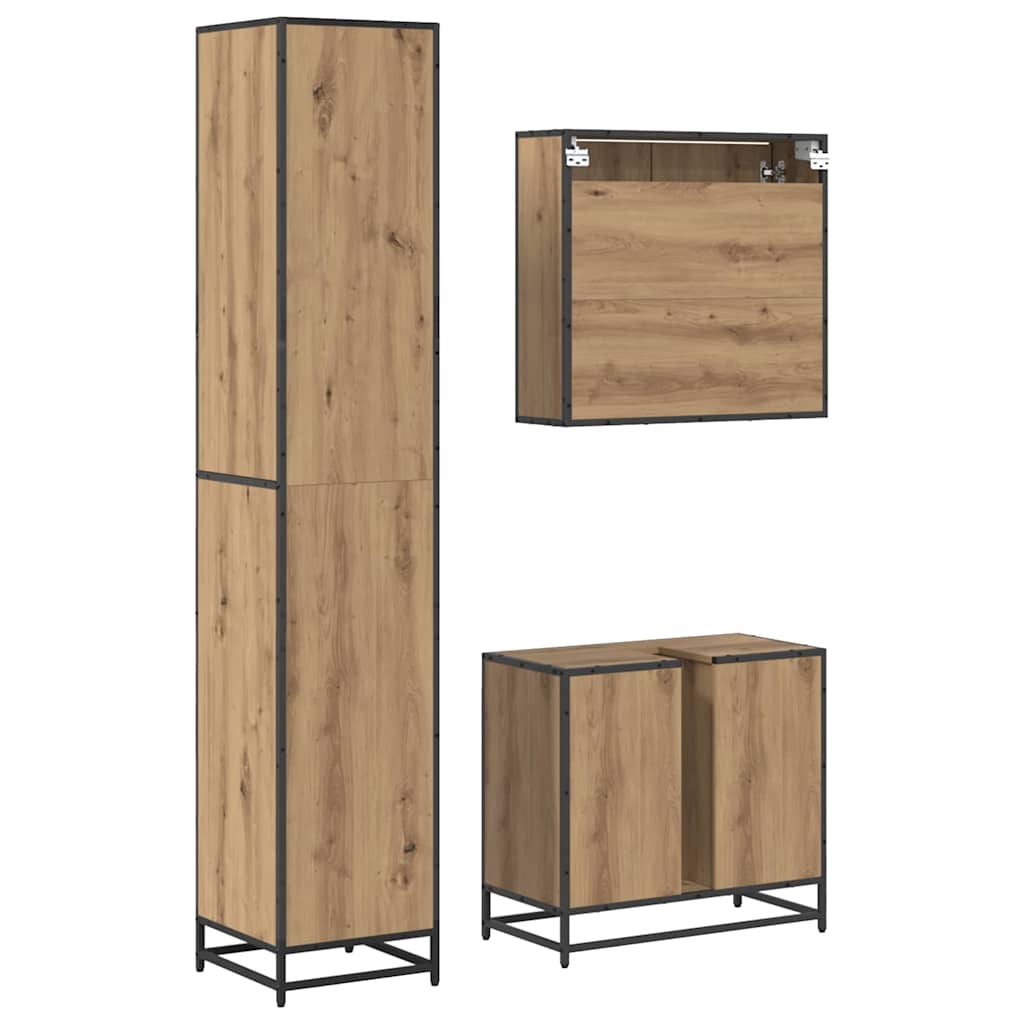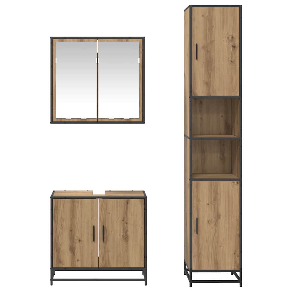 Deze houten badkamermeubelset is een mix van strak modern ontwerp en praktisch gebruik, waardoor elke badkamer verandert in een chique en functionele ruimte. Gemaakt van bewerkt hout en metaal, brengt het een hippe sfeer die zowel mooi als nuttig is.
