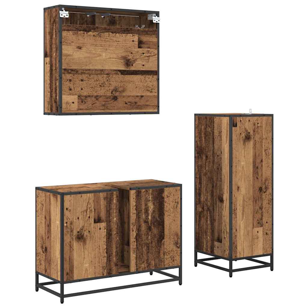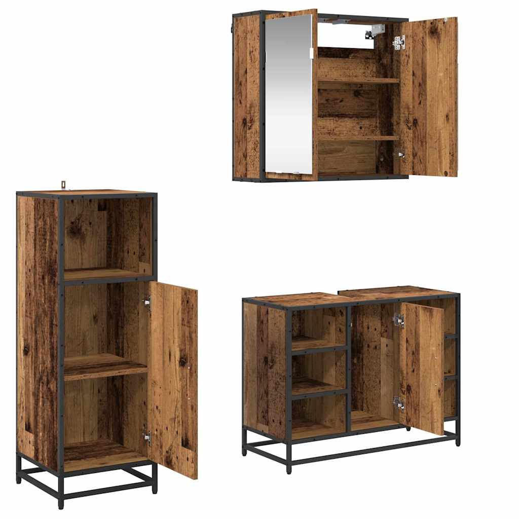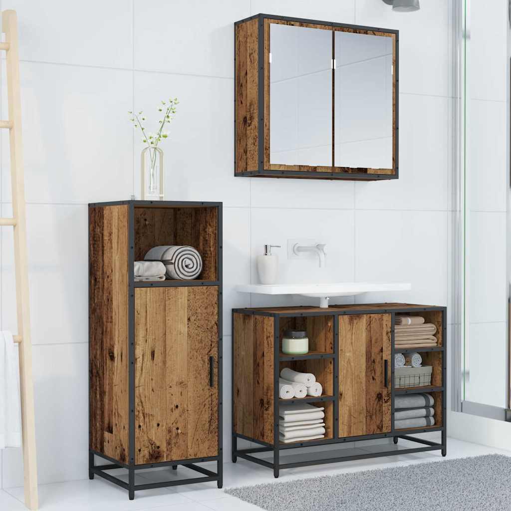 Deze houten badkamermeubelset is perfect voor wie een moderne en strakke vibe in zijn badkamer wil krijgen. Het bevat een spiegelkast, wastkast en een badkamerkast, allemaal met mooi bewerkt hout en metaal. De stijlvolle rechtlijnige vorm en minimalistische look passen perfect in hedendaagse badkamers en zorgen voor een verfijnde sfeer. De combinatie van donkere kleuren en strakke lijnen geeft een elegant tintje en helpt om je huis netjes en georganiseerd te houden.