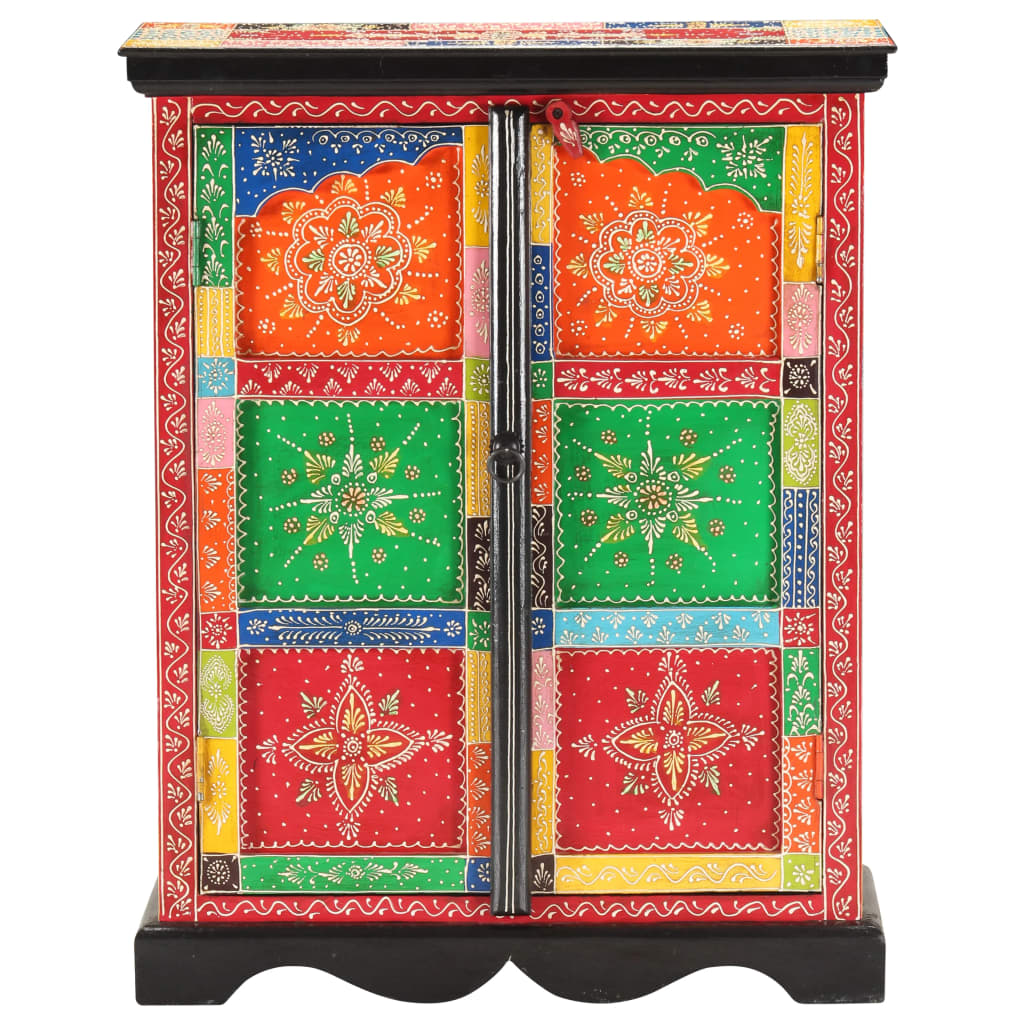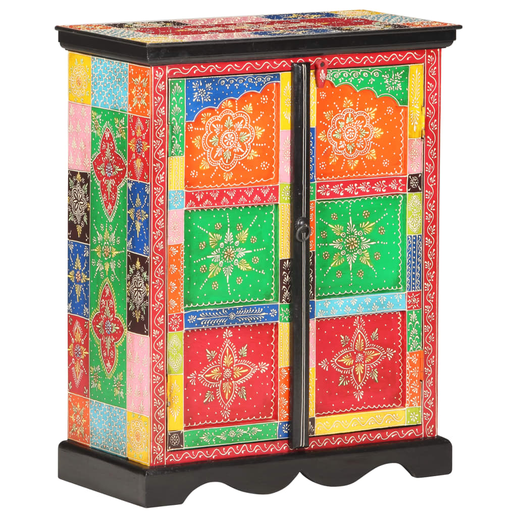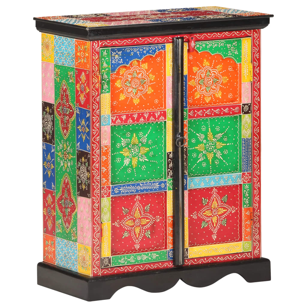 Deze bijzetkast is voorzien van rijke, handgeschilderde decoratieve details, waardoor hij een prachtige decoratie is voor je interieur. De houten kast heeft twee deuren, waardoor er voldoende ruimte is om tijdschriften, boeken en allerlei kleine spullen georganiseerd en binnen handbereik te houden. Je kunt fotolijsten of andere decoratieve spullen op het stevige blad plaatsen. De opbergkast is gemaakt van massief mangohout, een tropisch hardhout. Het heeft de kracht om veel gewicht te dragen en is bestand tegen slijtage. Bovendien zorgt het voortreffelijke vakmanschap ervoor dat elk stuk net iets anders is dan de rest.