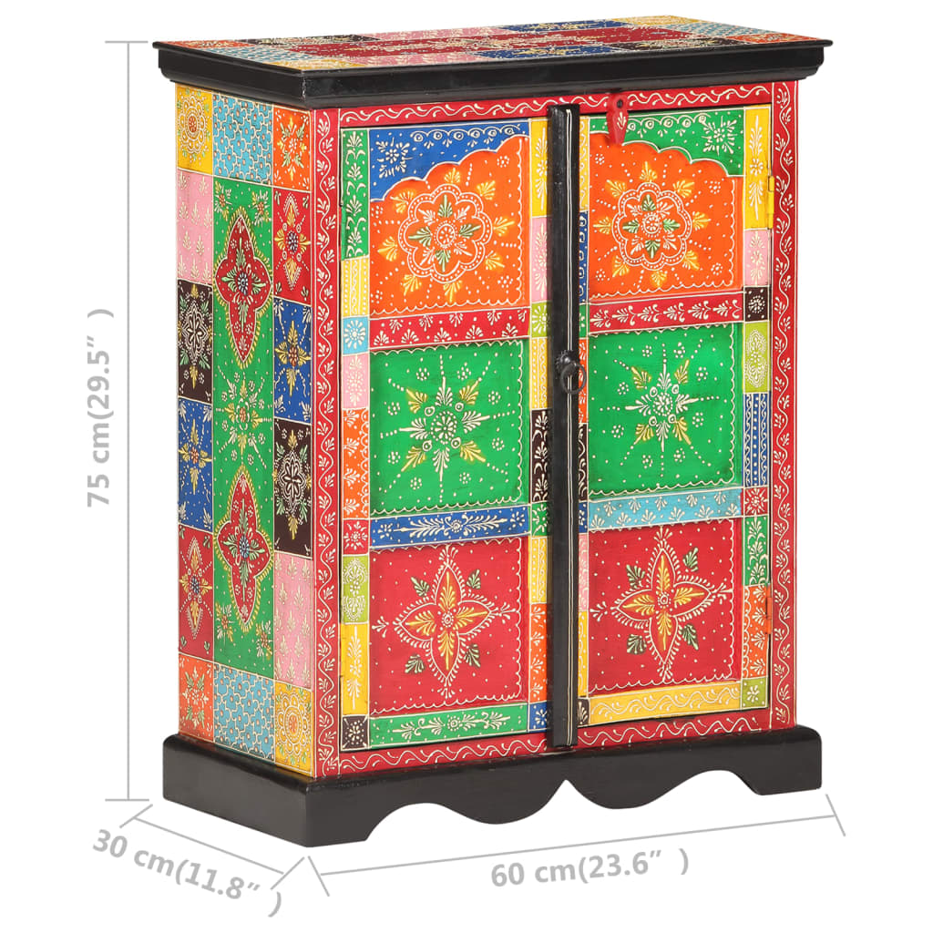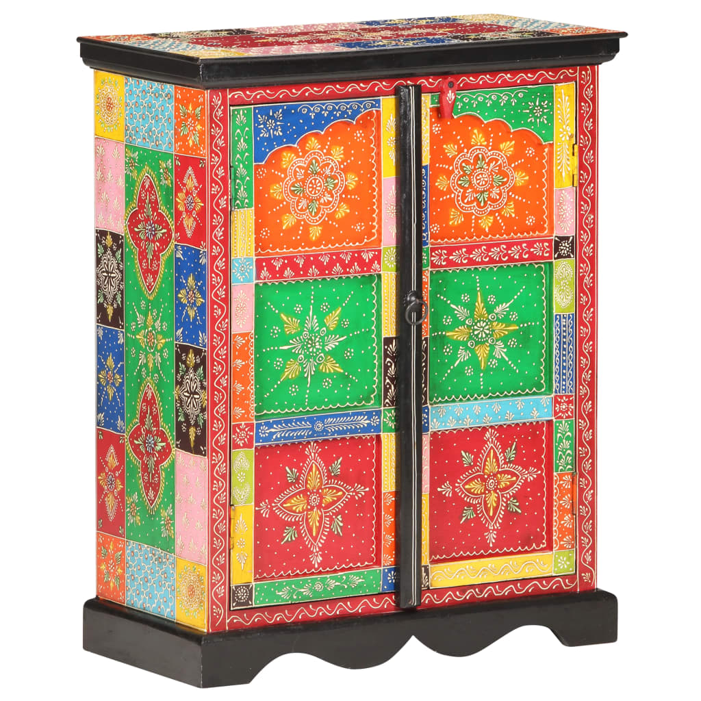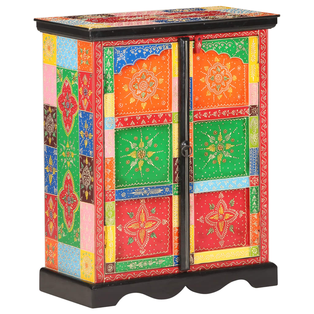 Deze bijzetkast is voorzien van rijke, handgeschilderde decoratieve details, waardoor hij een prachtige decoratie is voor je interieur. De houten kast heeft twee deuren, waardoor er voldoende ruimte is om tijdschriften, boeken en allerlei kleine spullen georganiseerd en binnen handbereik te houden. Je kunt fotolijsten of andere decoratieve spullen op het stevige blad plaatsen. De opbergkast is gemaakt van massief mangohout, een tropisch hardhout. Het heeft de kracht om veel gewicht te dragen en is bestand tegen slijtage. Bovendien zorgt het voortreffelijke vakmanschap ervoor dat elk stuk net iets anders is dan de rest.
